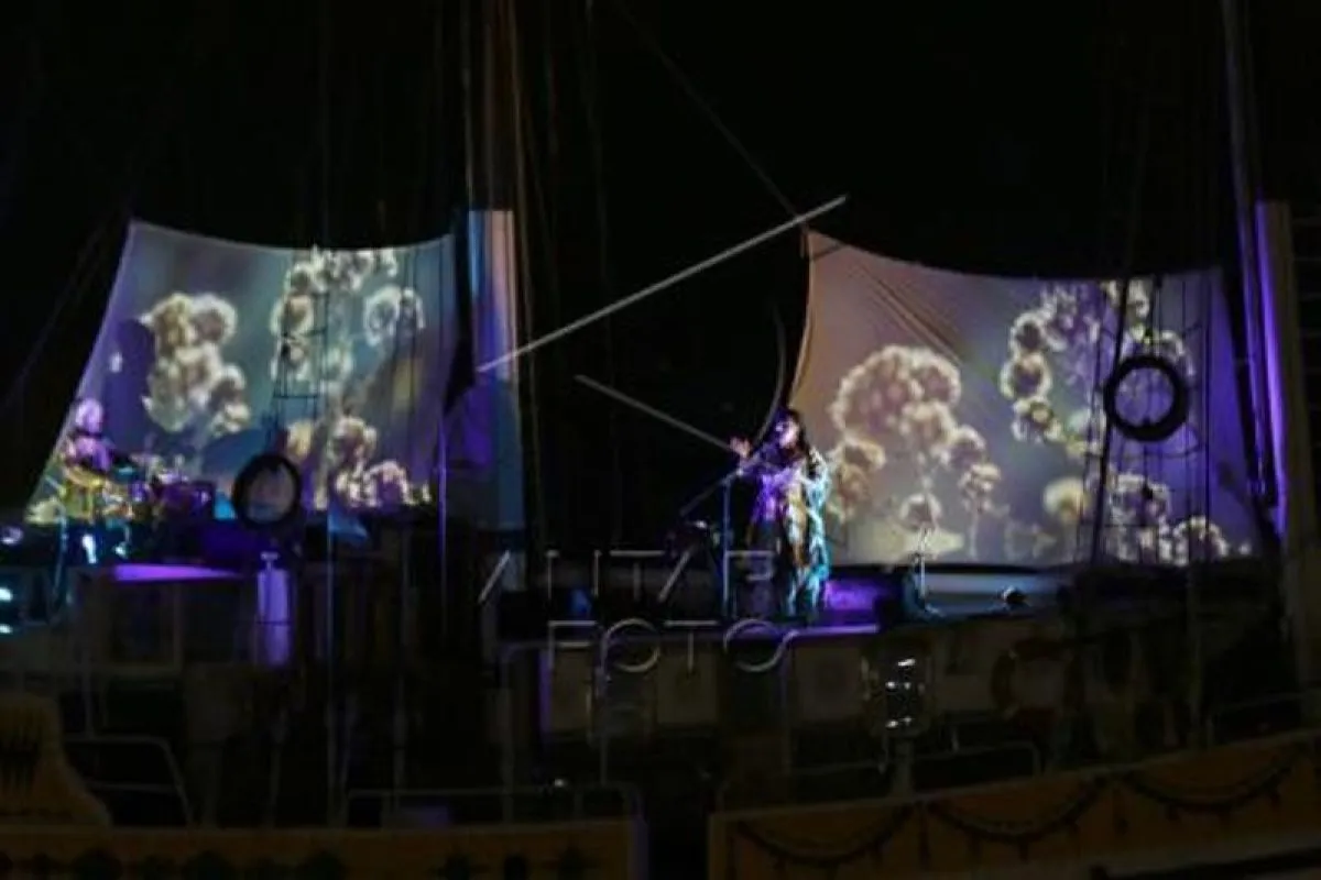 Musisi Grey Filastine (kiri) bersama Nova Ruth Setyaningtyas (kanan) konser multimedia di atas Kapal Arka Kinari di Dermaga Marina Boom, Banyuwangi, Jawa Timur, Senin (12/09/2022)malam. Konser di atas kapal menggunakan sumber energi terbarukan dari panel surya dan baterai untuk penggerak peralatan seperti Sound system, lighting dan film itu sebagai upaya mengabarkan perubahan iklim kepada masyarakat serta memberikan contoh kehidupan pasca energi fosil. ANTARA FOTO/Budi Candra Setya/foc.