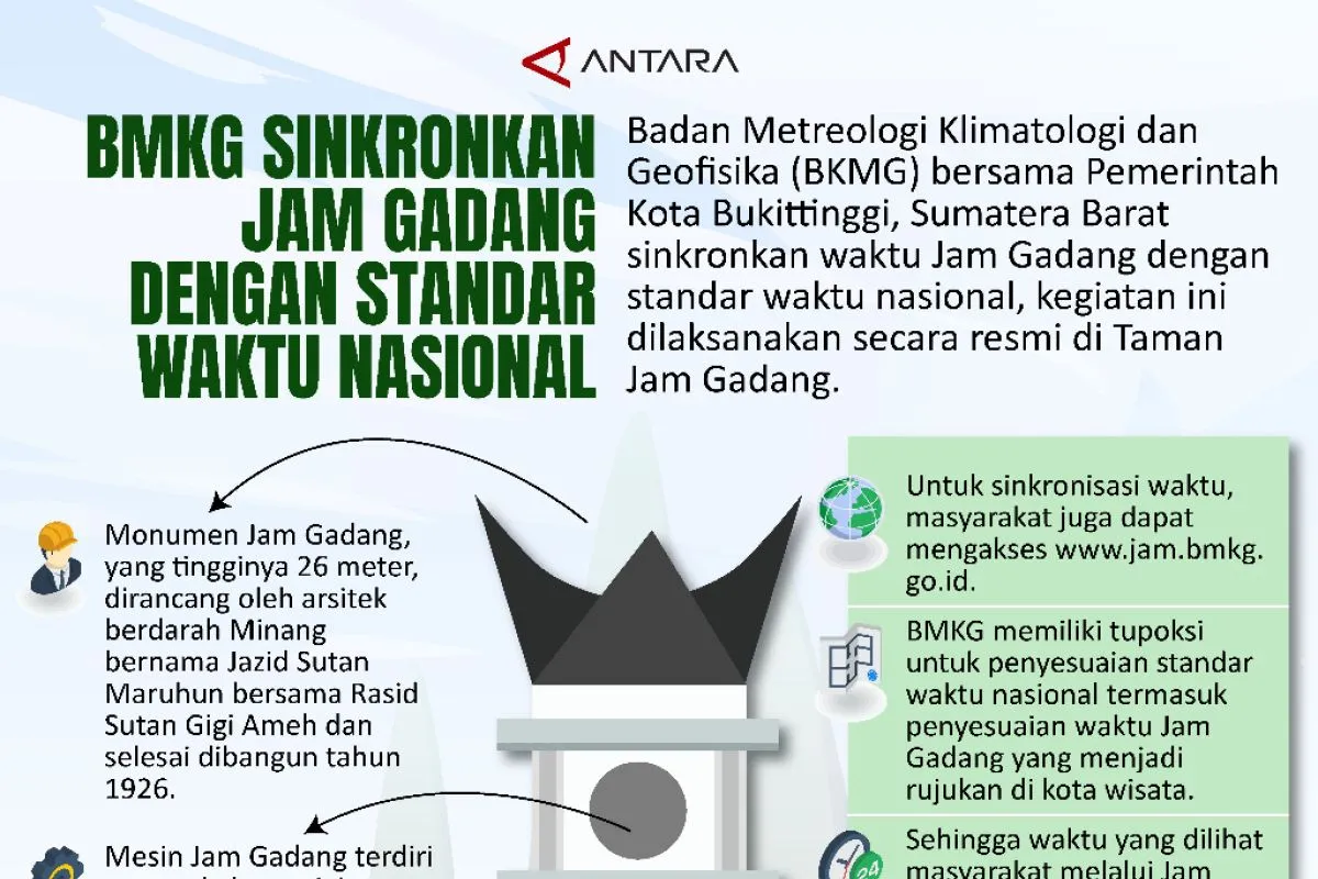 Padang (ANTARA) - Badan Metreologi Klimatologi dan Geofisika (BKMG) bersama Pemerintah Kota Bukittinggi, Sumatera Barat sinkronkan waktu Jam Gadang dengan standar waktu nasional, kegiatan ini dilaksanakan secara resmi di Taman Jam Gadang.