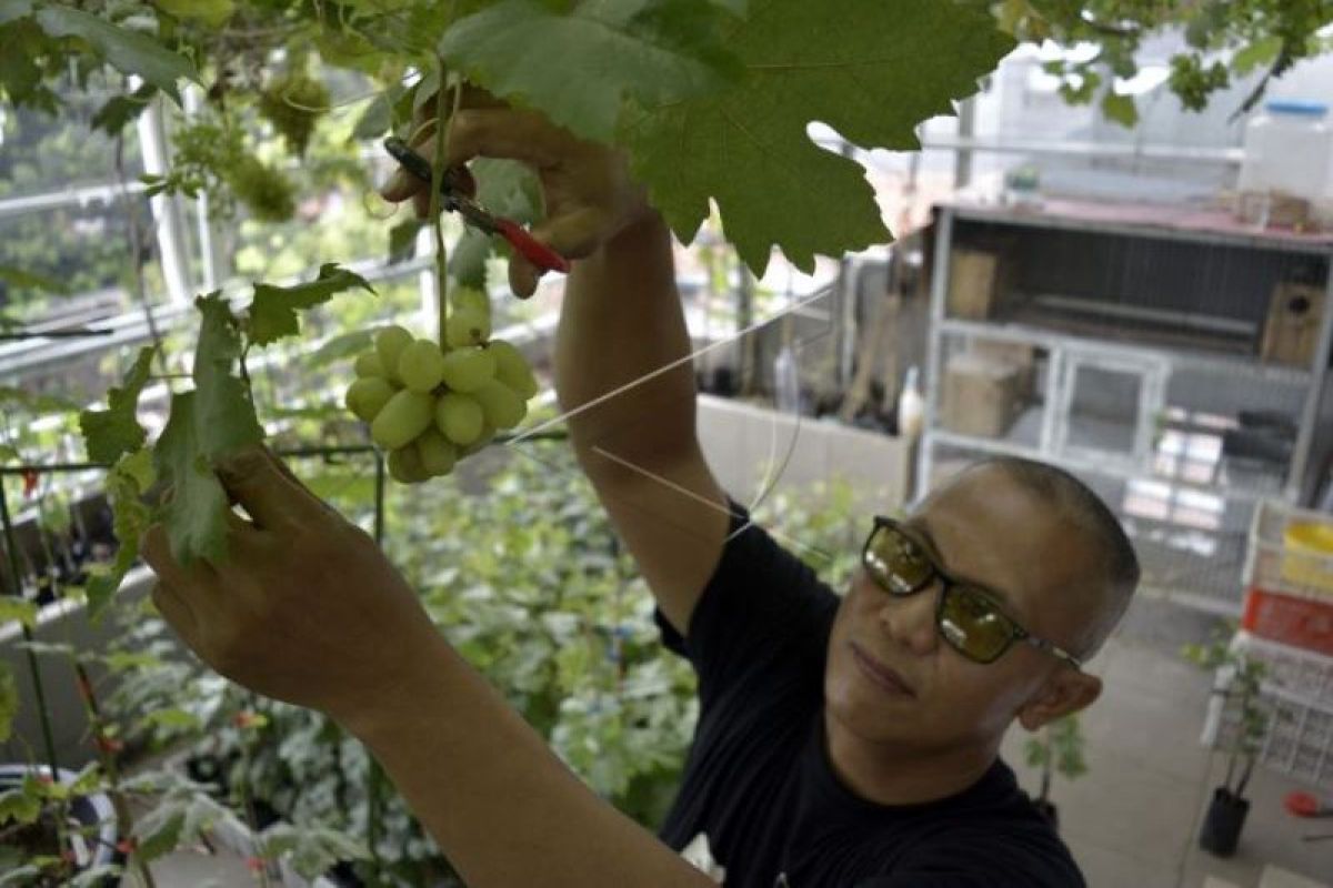 Suprianto (46) merawat kebun anggur impor di Gang Film, Jagakarsa, Jakarta, Rabu (12/10/2022). Pemerintah DKI Jakarta mendorong masyarakat untuk melakukan budidaya di lahan terbatas (urban farming) seperti anggur karena penjualan benih hortikultura meningkat 500 persen sejak pandemi 2021. ANTARA FOTO/Sulthony Hasanuddin/foc.