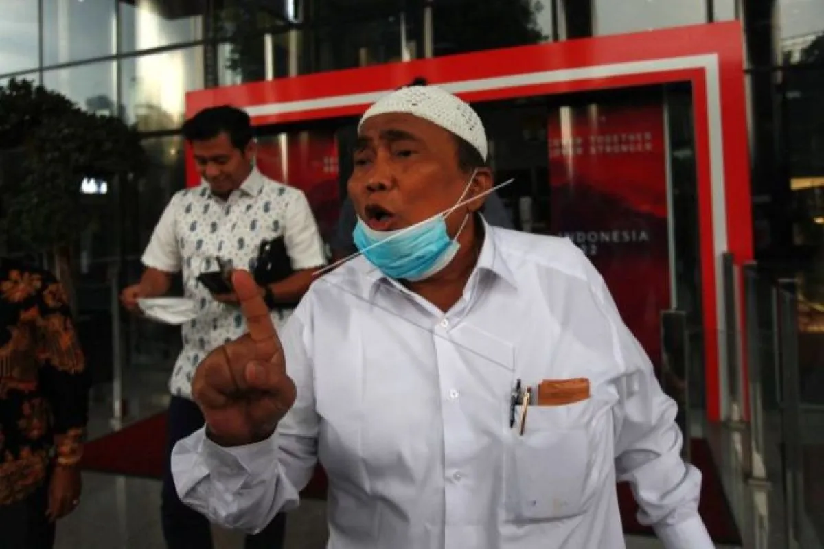 Pengusaha Haji Hadiri (kanan) menjawab pertanyaan wartawan usai menjalani pemeriksaan, di Gedung KPK Merah Putih, Jakarta, Rabu (23/11/2022 ). Haji Hadiri dimintai keterangan sebagai saksi untuk penyidikan kasus dugaan korupsi pengadaan Tanah di Kelurahan Pulo Gebang Kecamatan Cakung Jakarta Timur , Tahun 2018-2019, yang dijual PT Adonara Propertindo (AP), kepada Perumda Sarana Jaya. ANTARA FOTO/Reno Esnir/foc.