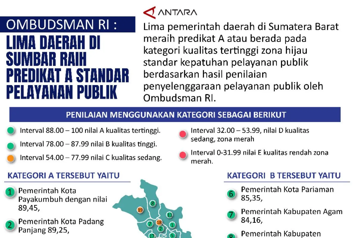 Padang (ANTARA) - Lima pemerintah daerah di Sumatera Barat meraih predikat A atau berada pada kategori kualitas tertinggi zona hijau standar kepatuhan pelayanan publik berdasarkan hasil penilaian penyelenggaraan pelayanan publik oleh Ombudsman RI.