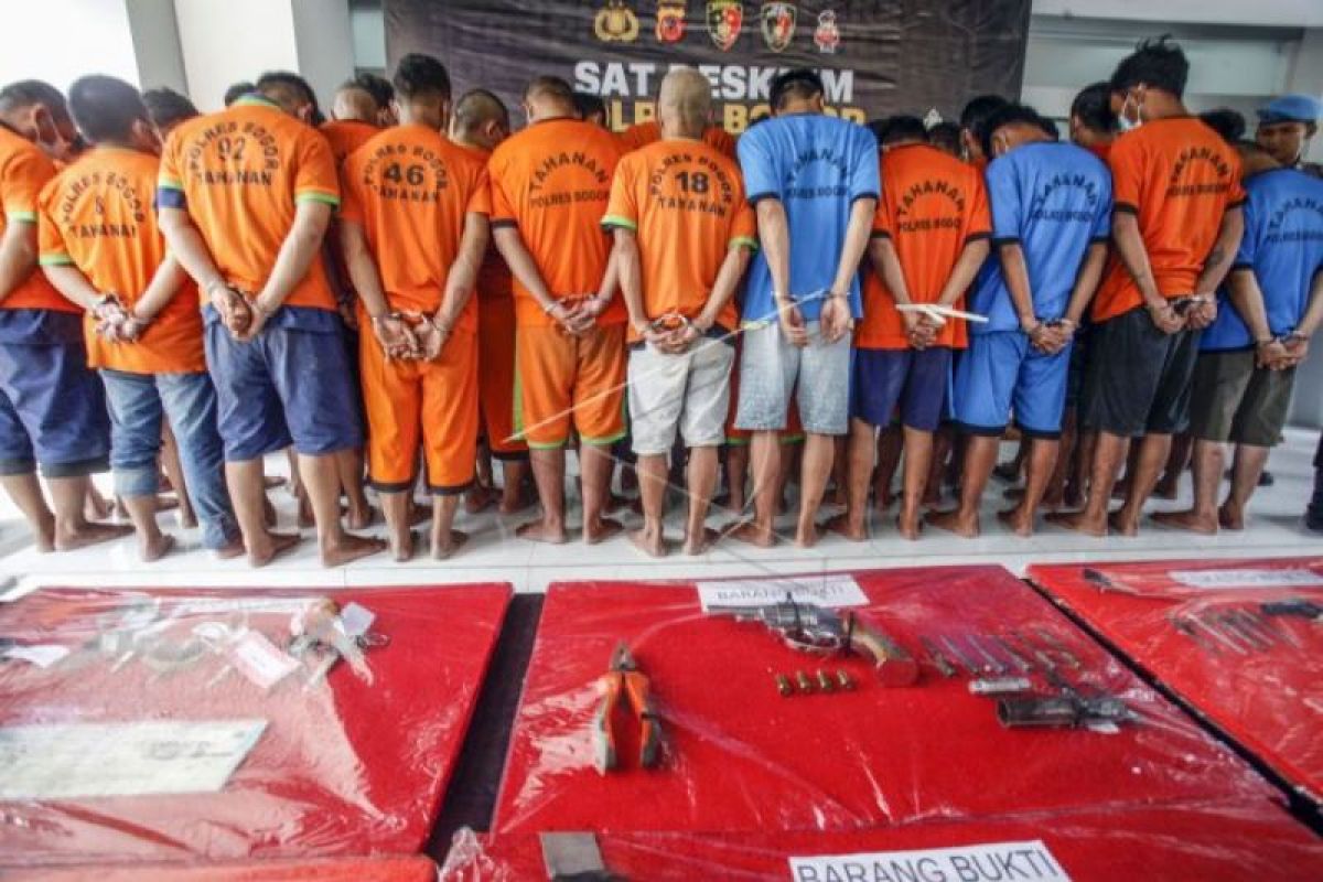 Sejumlah tersangka dan barang bukti diperlihatkan saat rilis kasus pencurian kendaraan bermotor (curanmor) di Polres Bogor, Kabupaten Bogor, Jawa Barat, Senin (6/3/2023). Sat Reskrim Polres Bogor berhasil menangkap 39 pelaku curanmor dan 39 unit kendaraan roda dua serta satu unit mobil dalam Operasi Kejahataan Kendaraan (Jaran) Lodaya 2023 selama dua pekan terakhir. ANTARA FOTO/Yulius Satria Wijaya/hp.