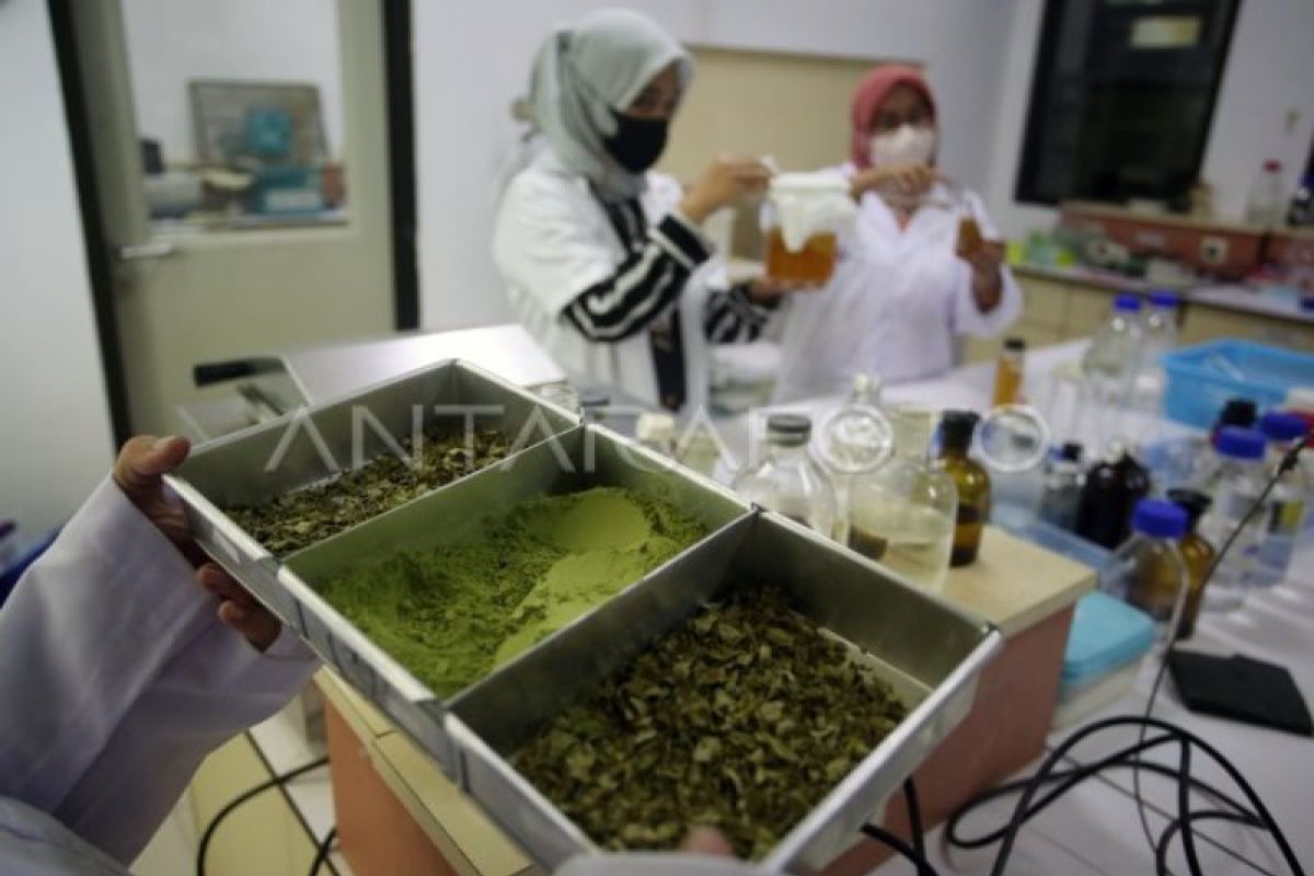 Peneliti Pusat Riset Teknologi dan Proses Pangan Badan Riset dan Inovasi Nasional (BRIN) melakukan proses ekstraksi daun kelor (Moringa Oliefera) untuk dijadikan biskuit dan minuman untuk meningkatkan ketersedian zat gizi (Bio Availability) di PUSPIPTEK Serpong, Tangerang Selatan, Banten, Jumat (17/3/2023). Penelitian ini bertujuan pemanfaatan daun kelor sebagai sumber gizi untuk anak dan ibu hamil, hal tersebut sesuai dengan anjuran Kementerian Kesehatan yang terus mendorong penelitian dan pemanfaatan daun kelor. ANTARA FOTO/Muhammad Iqbal/nz