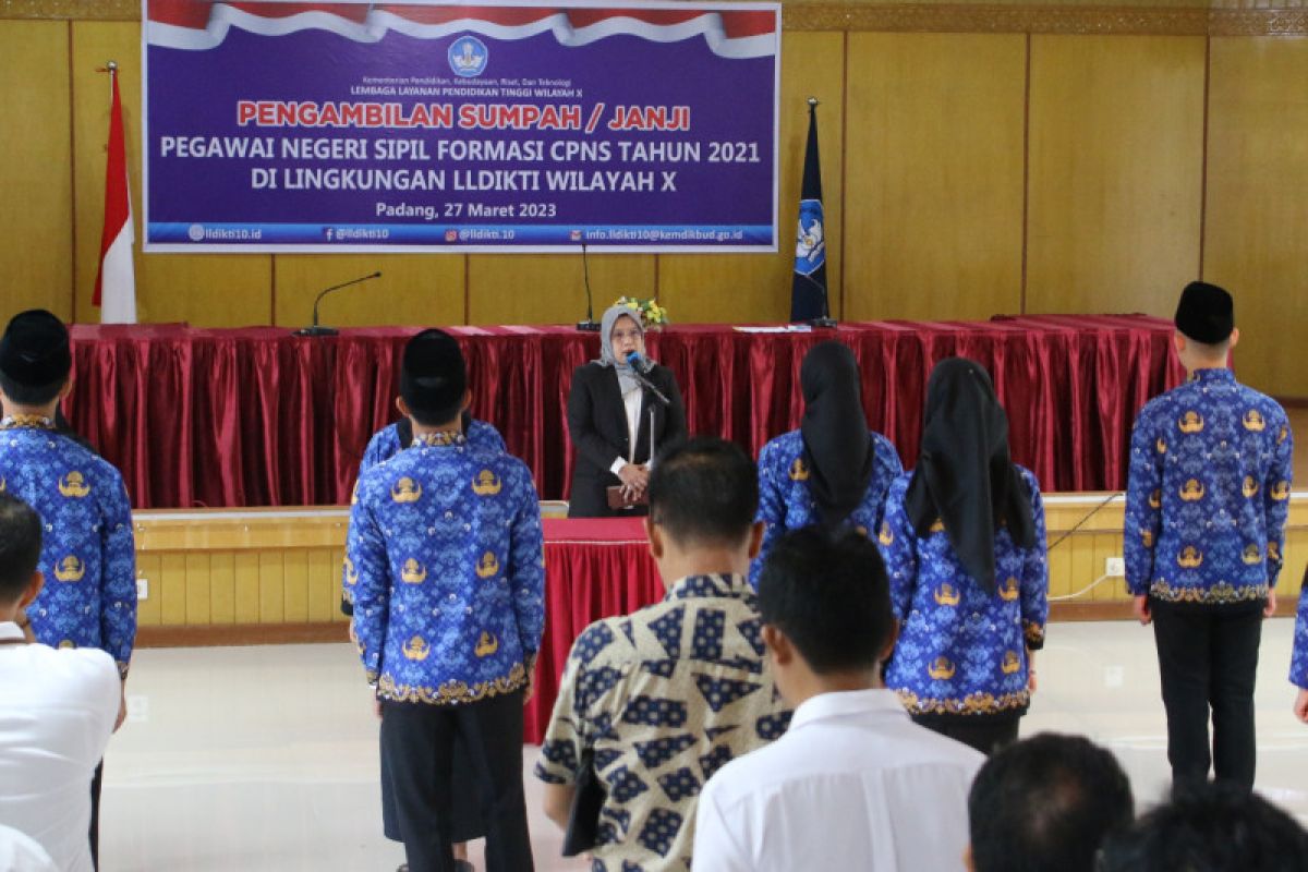 Padang (ANTARA) - Kepala LLDIKTI Wilayah X Afdalisma mengambil sumpah 10 orang Pegawai Negeri Sipil yang merupakan formasi CPNS tahun 2021 di aula lantai 3, Senin.