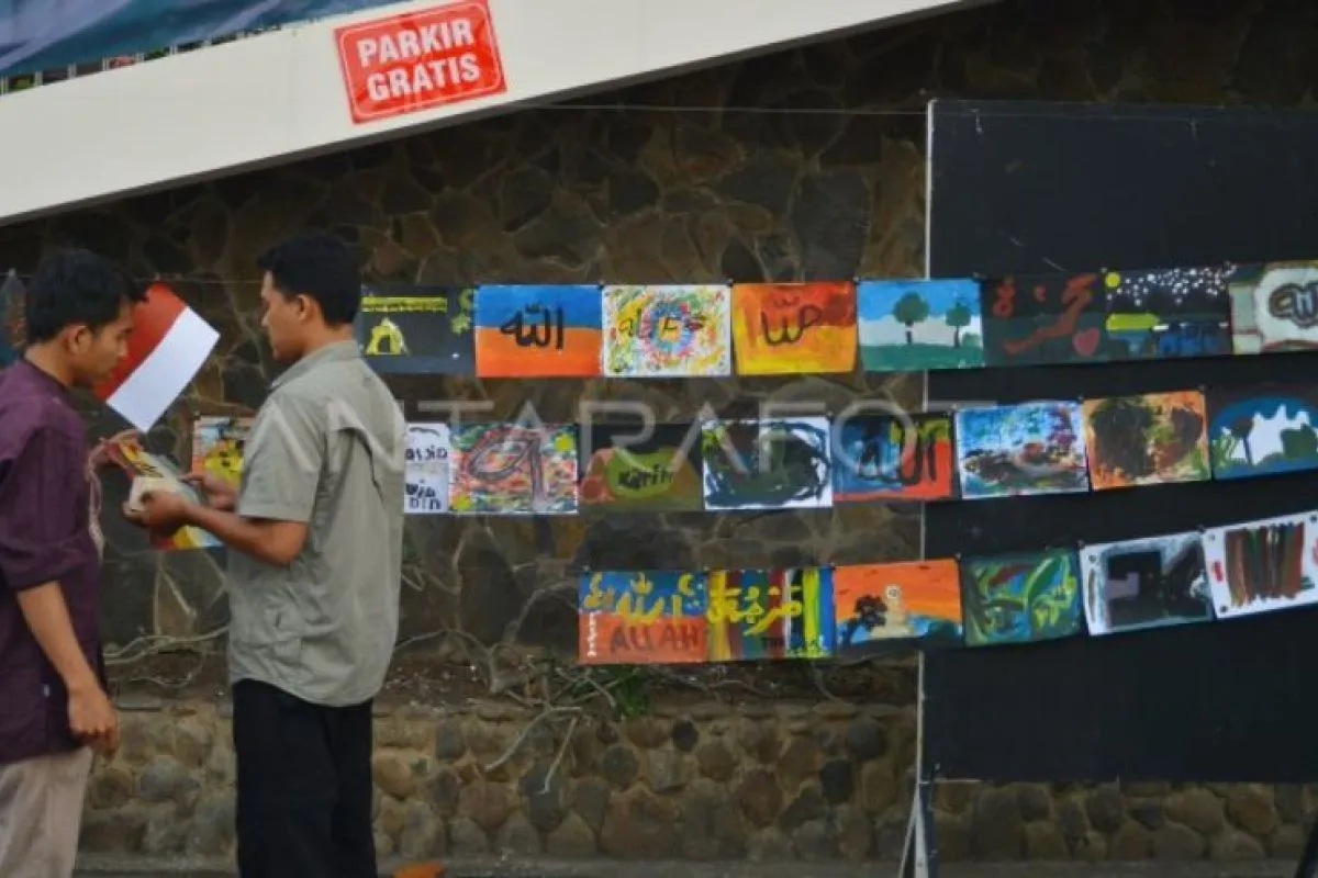 Panitia memajang karya Art Theraphy di halaman Masjid Mujahidin Padang, Sumatera Barat, Kamis (6/4/2023). Masjid Mujahidin Padang bersama komunitas Seni Dangau Studio membuka Art Therapy gratis bagi jemaah dan warga yang bermanfaat untuk mengurangi tekanan psikologis, mengurangi gejala trauma, dan menurunkan tingkat depresi. ANTARA FOTO/Iggoy el Fitra/tom.