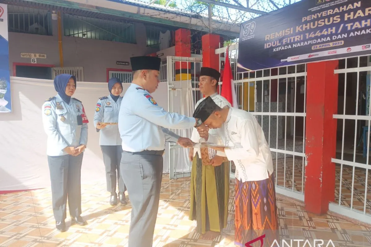 Kepala Lapas Kelas III Talu Donni Isa Dermawan secara simbolis menyerahkan remisi khusus Lebaran 2023 kepada warga binaan, Sabtu. (Antara/HO).