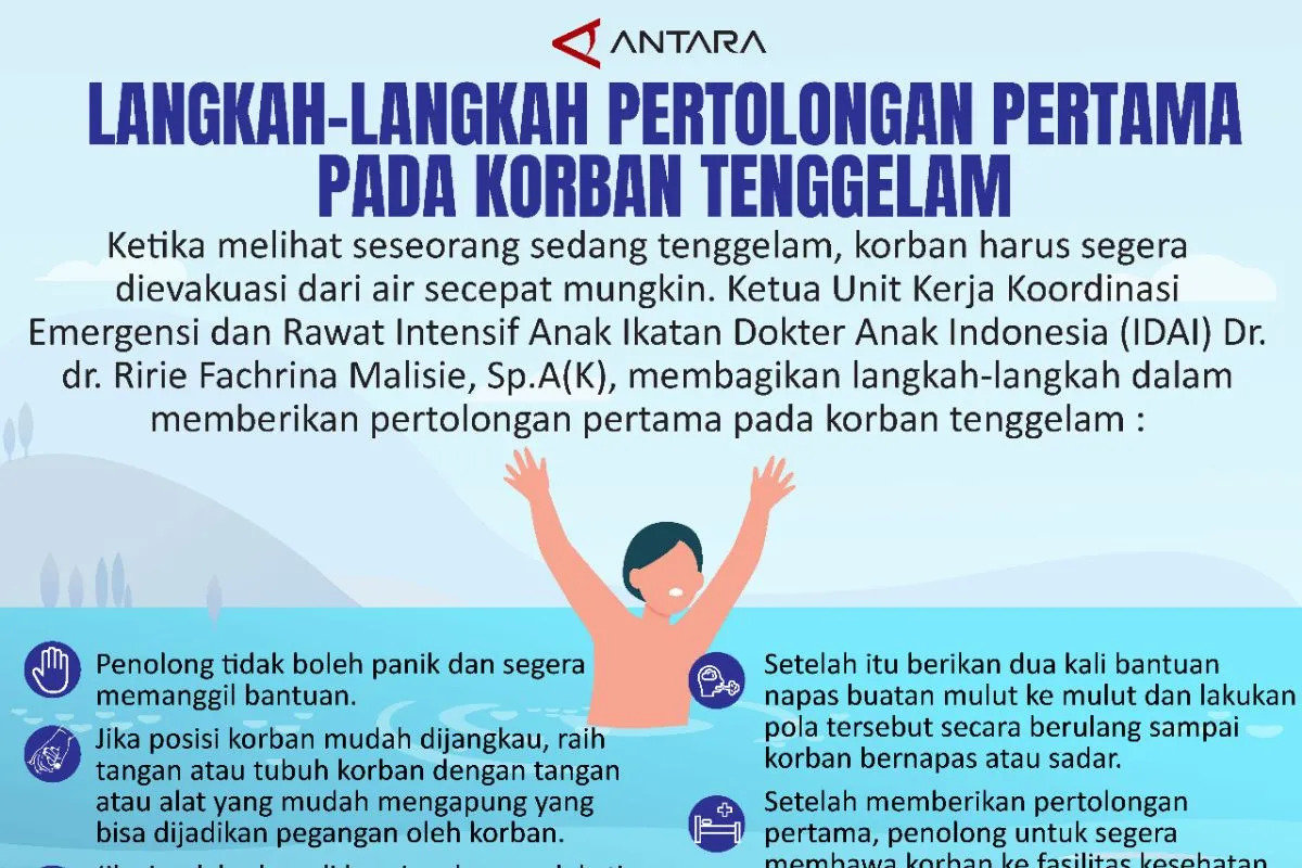 Padang (ANTARA) - Ketika melihat seseorang sedang tenggelam, korban harus segera dievakuasi dari air secepat mungkin. Ketua Unit Kerja Koordinasi Emergensi dan Rawat Intensif Anak Ikatan Dokter Anak Indonesia (IDAI) Dr. dr. Ririe Fachrina Malisie, Sp.A(K), membagikan langkah-langkah dalam memberikan pertolongan pertama pada korban tenggelam :