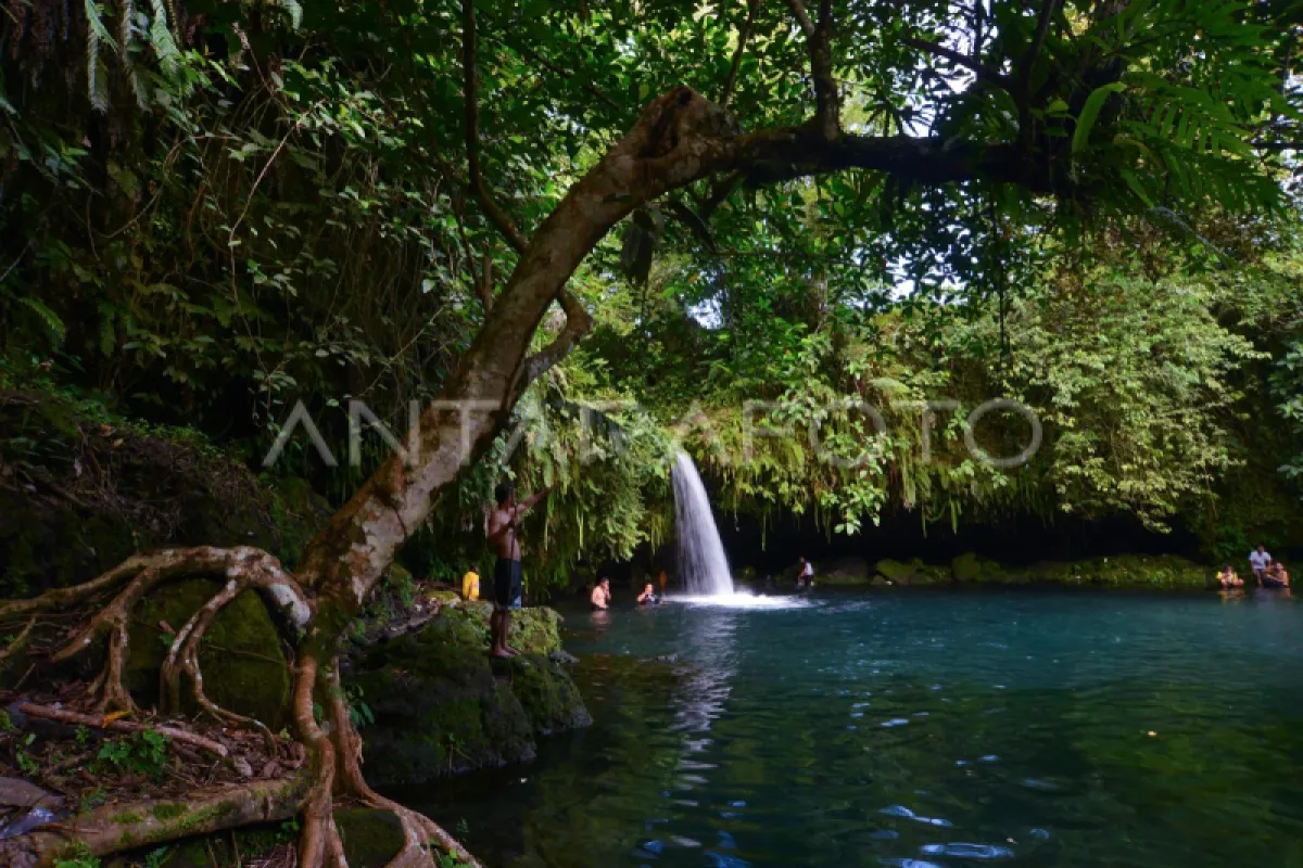 Sejumlah pengunjung bermain air di pemandian alam Lubuk Bonta, Padang Pariaman, Sumatera Barat, Minggu (18/6/2023). Pemandian yang airnya bersumber dari mata air dan sudah terkenal sejak tahun 70-an itu kini kondisi fasilitas pendukungnya tidak terawat. ANTARA FOTO/Iggoy el Fitra/YU