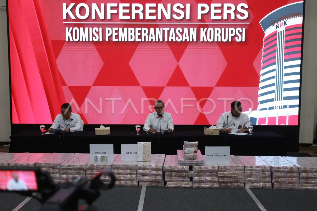 Wakil Ketua KPK Alexander Marwata (tengah), Plt. Deputi Penindakan dan Eksekusi KPK Asep Guntur Rahayu (kiri) dan Jubir KPK Ali Fikri (kanan), menyampaikan perkembangan kasus Tindak Pidana Pencucian Uang (TPPU) untuk tersangka Gubernur Papua (nonaktif) Lukas Enemba, dalam konferensi pers, di Gedung Juang KPK Merah Putih, Jakarta, Senin (26/6/2023). Sebanyak 27 macam aset berupa uang, emas/perhiasan, kendaran, rumah/aparteman, dan lahan, dengan nilai ratusan miliyar disita KPK sebagai barang bukti untuk diserahkan kepada negara sebagai pemulihan keuangan negara melalui asset recovery. ANTARA FOTO/Reno Esnir/hp.