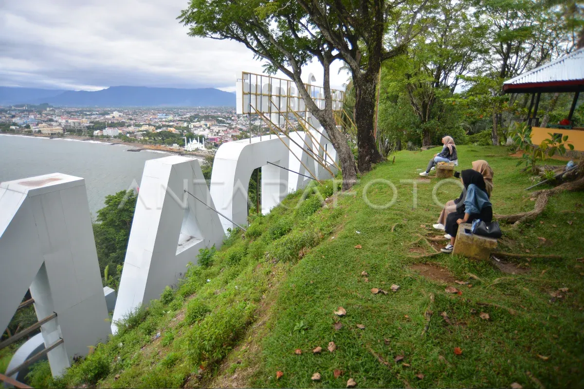 Pengunjung menikmati panorama kota dari puncak Gunung Padang di Padang, Sumatera Barat, Selasa (11/7/2023). Pemkot Padang tahun ini mengembangkan wisata atraksi di Gunung Padang yang merupakan perbukitan setinggi 85 meter tersebut untuk menambah daya tarik bagi wisatawan lokal dan mancanegara. ANTARA FOTO/Iggoy el Fitra/tom.