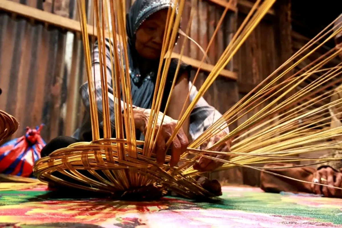 Meski diusia yang sudah larut senja, tangan Etek Kalek tampak masih seperti muda, jari-jarinya lihai memutar dan menganyam lidi menjadi senggan.