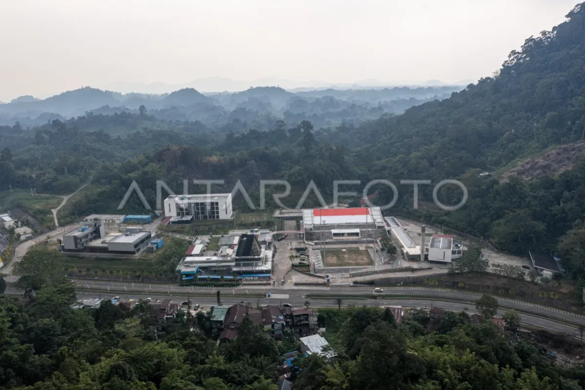 Foto udara pasar entikong yang berada di Jalan Lintas Malindo, Kabupaten Sanggau, Kalimantan Barat, Minggu (13/8/2023). Menurut pengakuan pedagang, pasca penutupan sementara akibat pandemi COVID-19 yang lalu, transaksi jual-beli di pasar tersebut masih sepi pembeli. ANTARA FOTO/Nova Wahyudi/nz