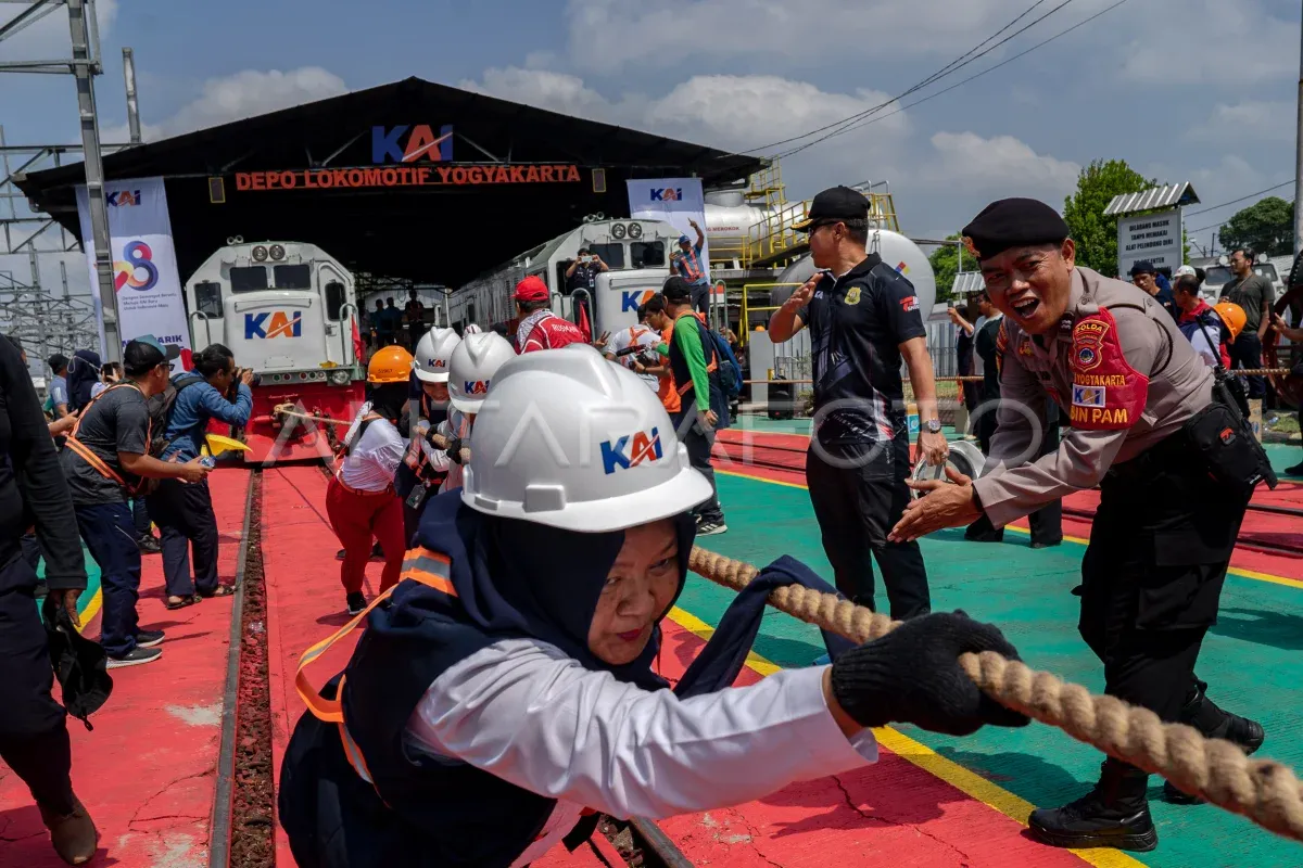 Peserta menarik lokomotif dengan tali saat lomba tarik lokomotif di Depo Lokomotif PT Kereta Api Indonesia (KAI) Daop 6 Yogyakarta, Rabu (27/9/2023). Acara yang diikuti dari berbagai instansi mulai dari Polisi, Dishub, Dinas Pariwisata hingga awak media itu menjadi rangkaian kegiatan perayaan HUT ke-78 KAI. ANTARA FOTO/Andreas Fitri Atmoko/rwa.