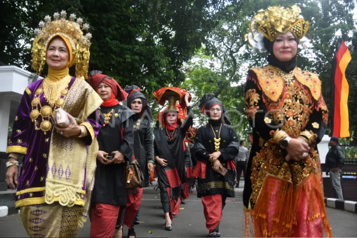Sejumlah warga mengenakan pakaian adat Sumatera Barat saat mengikuti prosesi Manjunjuang Dulang di Plaza Balaikota Bogor, Jawa Barat, Sabtu (21/10/2023). Pemerintah Kota Bogor bersama Bundo Kanduang Jawa Barat menggelar acara Urang Minang Baralek Gadang dengan tujuan untuk menjalin tali silaturahim dan melestarikan seni dan budaya Minangkabau. ANTARA FOTO/Arif Firmansyah/nym.