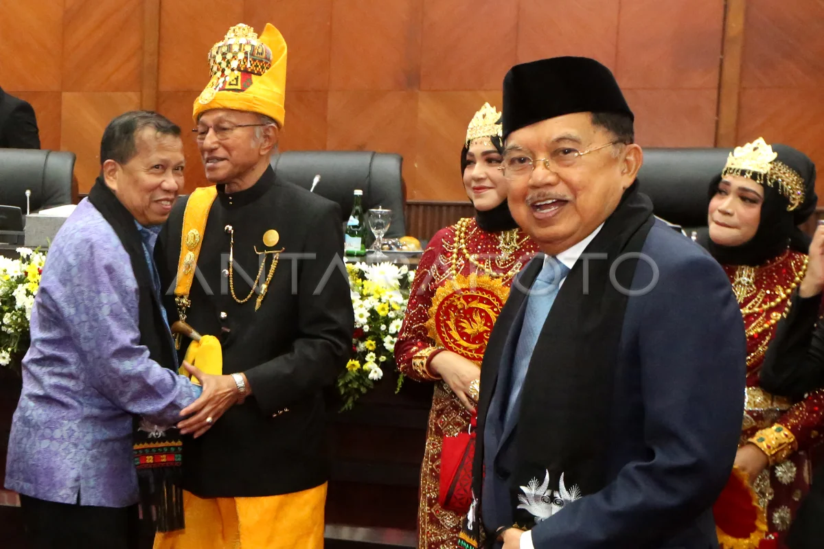 Mantan Wakil Presiden yang juga tokoh perdamaian Aceh Jusuf Kalla (kanan) bersama Ketua juru runding Republik Indonesia dan mantan Menteri Hukum dan HAM Hamid Awaluddin (kiri) memberikan ucapan selamat kepada Paduka Tgk. Malik Mahmud Al-Haythar (dua kiri) yang kembali dilantik sebagai Wali Nanggroe Aceh periode 2023-2028 usai rapat paripurna istimewa DPRA di Banda Aceh, Aceh, Jumat (15/12/2023). Paduka Tgk. Malik Mahmud Al-Haythar untuk ketiga kalinya memimpin lembaga Wali Nanggroe yang dibentuk khusus sebagai amanah kesepakatan damai MoU Helsinki antara Pemerintah Indonesia dengan Gerakan Aceh Merdeka (GAM) yang telah dituangkan dalam Undang-Undang Nomor 11 Tahun 2006 tentang Pemerintahan Aceh. ANTARA FOTO/Irwansyah Putra.