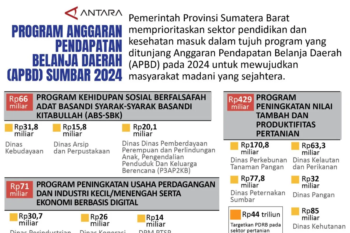 Padang (ANTARA) - Pemerintah Provinsi Sumatera Barat memprioritaskan sektor pendidikan dan kesehatan masuk dalam tujuh program yang ditunjang Anggaran Pendapatan Belanja Daerah (APBD) pada 2024 untuk mewujudkan masyarakat madani yang sejahtera.
