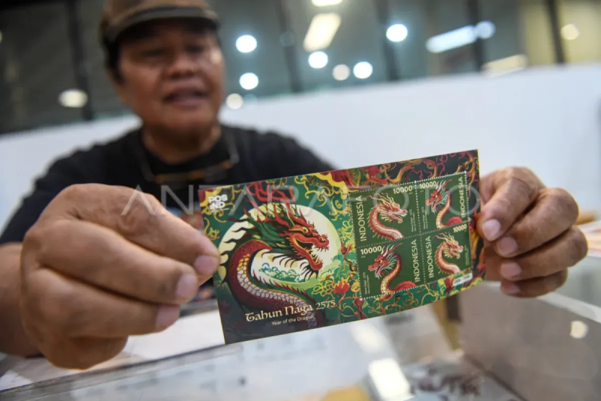 Petugas menunjukkan prangko seri Imlek 2024 Tahun Naga Kayu 2575 di Kantor Pos Indonesia, Jakarta, Selasa (6/2/2024). Prangko tersebut dijual mulai dari harga Rp.20.000 - Rp.63.000. ANTARA FOTO/Muhammad Adimaja/foc.