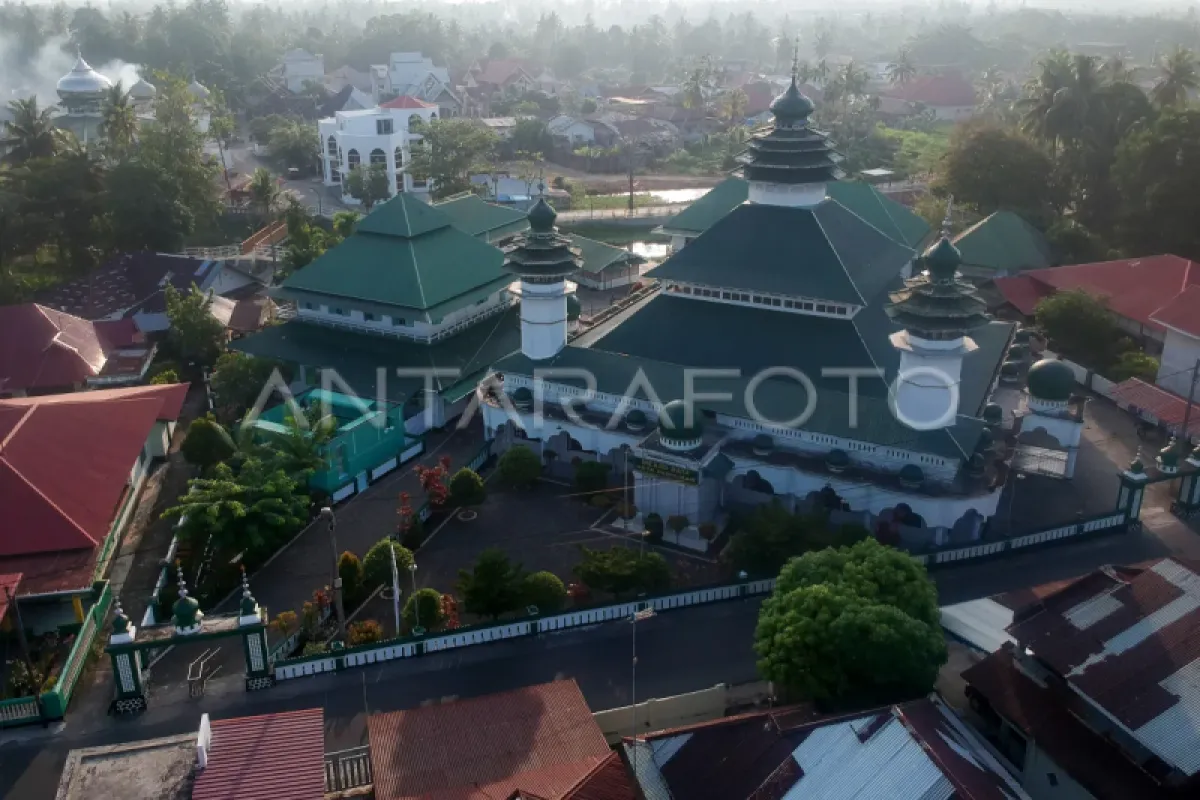 Foto udara Masjid Raya Pariaman, di Kampung Perak, Pariaman, Sumatera Barat, Jumat (22/3/2024). Masjid yang merupakan cagar budaya tersebut dibangun sekitar tahun 1882 yang diprakarsai ulama Syekh Muhammad Jamil dan menjadi masjid batu pertama di Kota Tabuik. ANTARA FOTO/Iggoy el Fitra/tom.