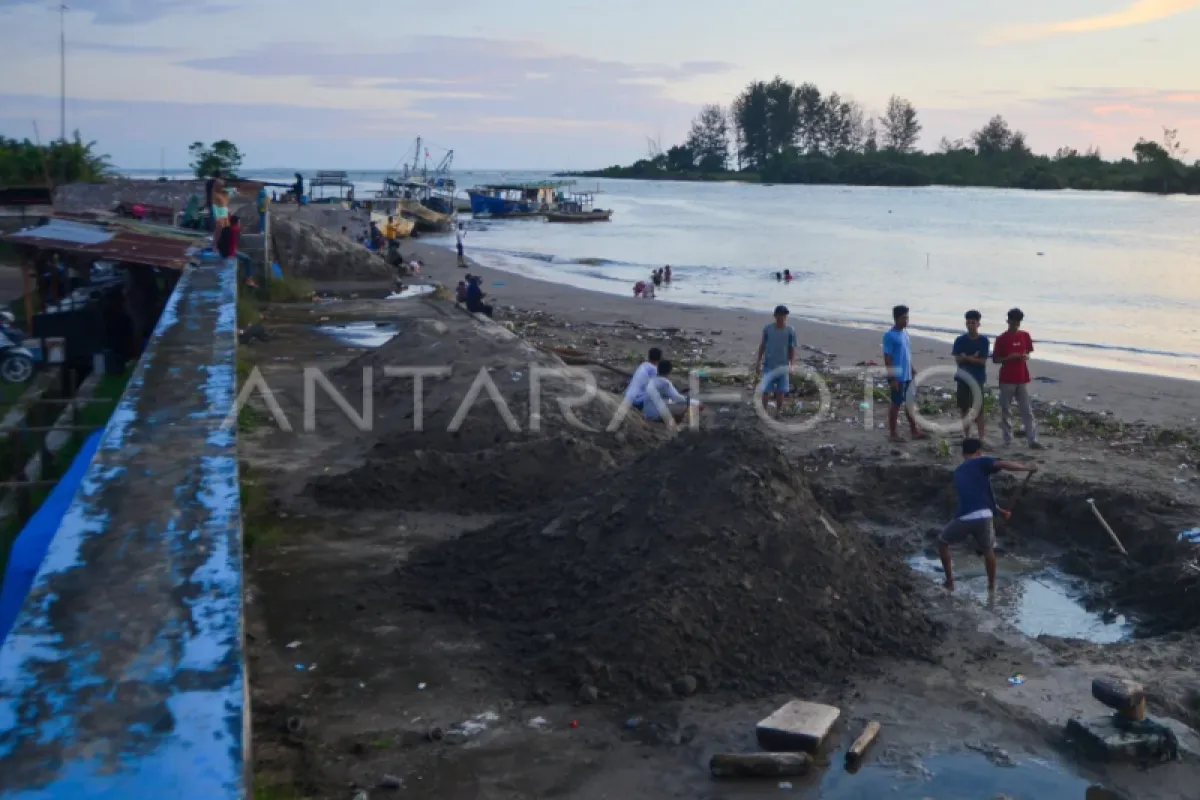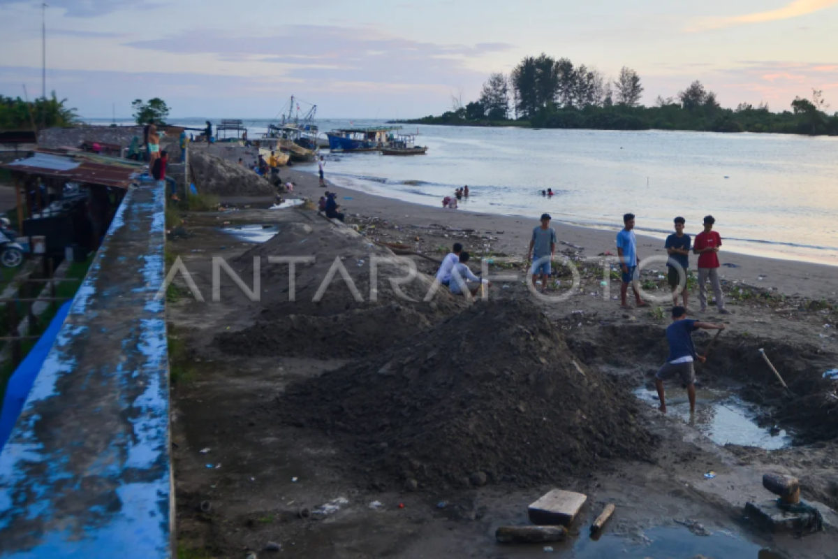 Warga menggali pasir yang menimbun kawasan pangkalan pendaratan ikan Muaro Anai, Padang, Sumatera Barat, Minggu (5/5/2024). Menurut nelayan pelabuhan alternatif tersebut sudah mengalami pendangkalan sejak sebulan terakhir akibat bertumpuknya sedimentasi lumpur dan pasir sehingga membuat kapal tidak dapat bersandar. ANTARA FOTO/Iggoy el Fitra/nym.