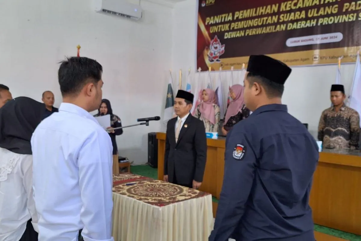 Komisi Pemilihan Umum (KPU) Kabupaten Agam, Sumatera Barat melantik sebanyak 80 anggota Panitia Pemungutan Kecamatan (PPK) untuk pelaksanaan Pemungutan Suara Ulang (PSU) anggota DPD RI pada 13 Juli 2024.