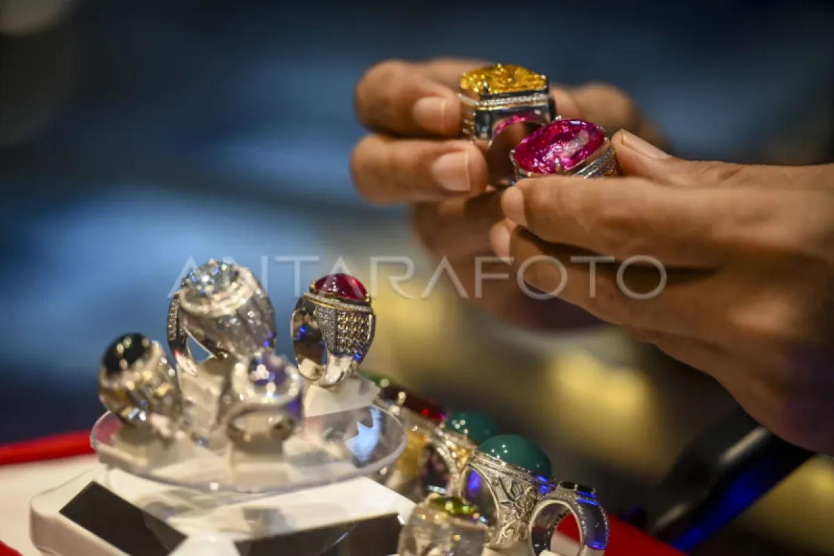 Pedagang memasarkan batu cicin secara daring di Pasar Rawa Bening, Jakarta, Rabu (26/6/2024). Sejumlah pedagang setempat mengatakan bahwa peminat batu akik dan permata di kawasan pasar tersebut masih banyak meski tren batu akik dan permata tidak seperti 2015 lalu. ANTARA FOTO/ Erlangga Bregas Prakoso/rwa.