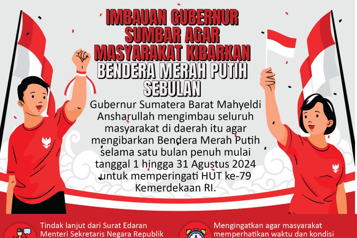 Padang (ANTARA) - Gubernur Sumatera Barat Mahyeldi Ansharullah mengimbau seluruh masyarakat di daerah itu agar mengibarkan Bendera Merah Putih selama satu bulan penuh mulai tanggal 1 hingga 31 Agustus 2024 untuk memperingati HUT ke-79 Kemerdekaan RI.