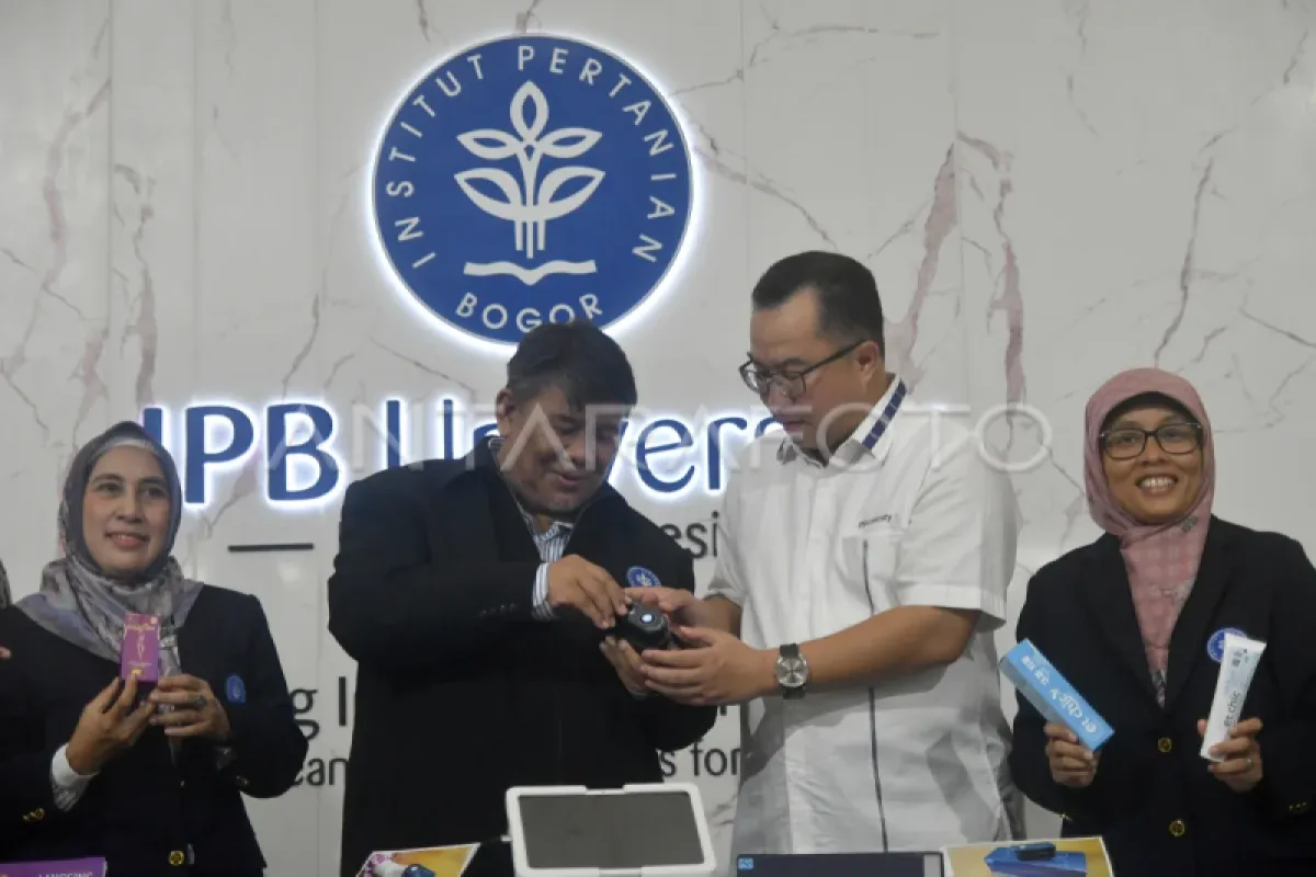 Rektor IPB University Arif Satria (kedua kanan) berbincang dengan peneliti IPB University Irzaman (kedua kiri), Yessie Widya Sari (kanan) dan Dyah Iswantini (kiri) saat peluncuran inovasi IPB bidang kesehatan di Lobby Rektorat Andi Hakim Nasoetion, Kampus IPB University, Bogor, Jawa Barat, Jumat (23/8/2024). IPB University meluncurkan alat pengukur hemoglobin (Hb) dalam darah yang bisa digunakan tanpa invasi (suntik), produk herbal pelangsing tubuh dari tanaman obat Indonesia serta produk kesehatan gigi dan mulut yang dapat membantu menurunkan tendensi karies gigi di Indonesia. ANTARA FOTO/Arif Firmansyah/nym.