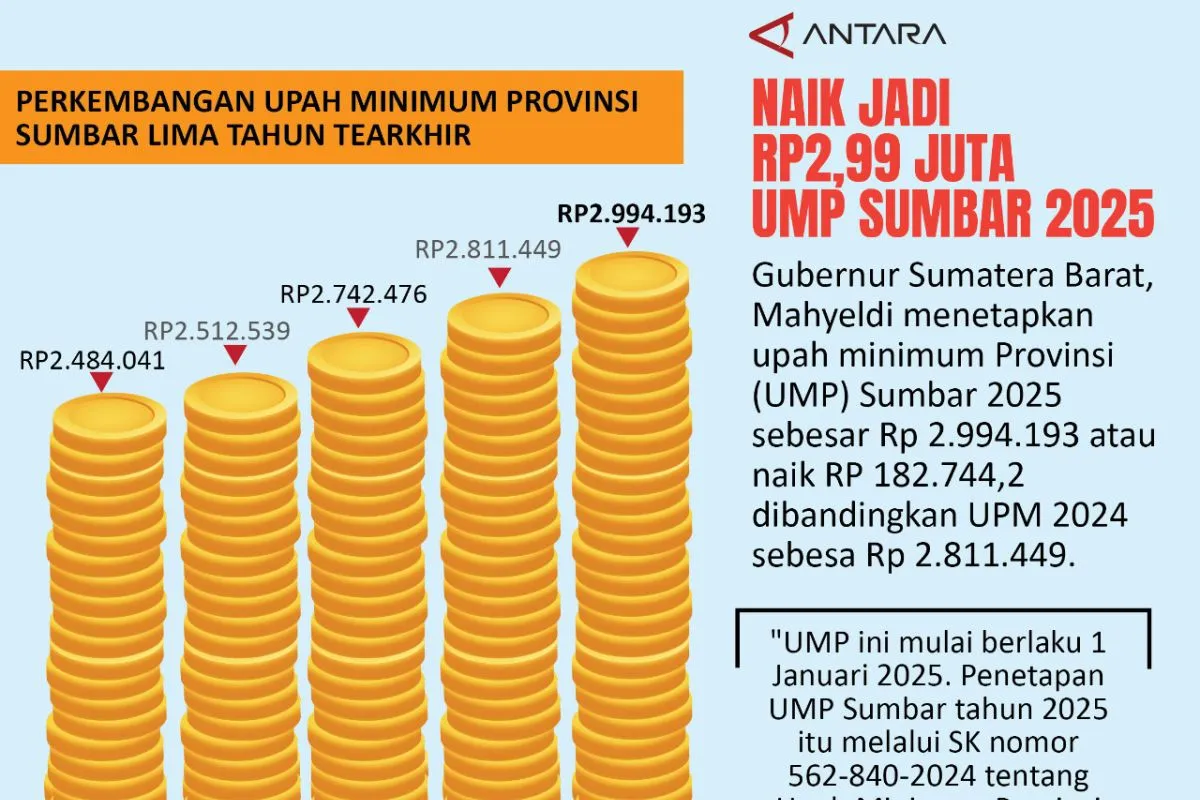 Naik jadi Rp2,99 juta UMP Sumbar 2025 id Gubernur Sumatera Barat, Mahyeldi,UMP Sumbar 2025 Kamis, 12 Desember 2024 11:55 WIB Padang (ANTARA) - Gubernur Sumatera Barat, Mahyeldi menetapkan upah minimum Provinsi (UMP) Sumbar 2025 sebesar Rp 2.994.193. atau naik RP 182.744,2 dibandingkan UPM 2024 sebesar 2.811.449.