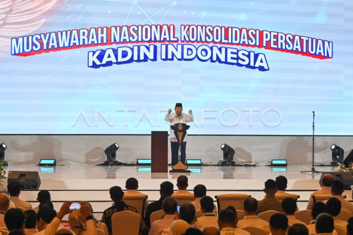 Presiden Prabowo Subianto menyampaikan sambutan dalam Musyawarah Nasional Konsolidasi Persatuan Kamar Dagang dan Industri (Kadin) Indonesia di Jakarta, Kamis (16/1/2025). Dalam Munas yang beragendakan pengukuhan Anindya Bakrie sebagai Ketua Umum Kadin Indonesia periode 2024-2029 tersebut Presiden meminta kalangan pengusaha menjadi motor utama pencipta kesejahteraan masyarakat Indonesia.
