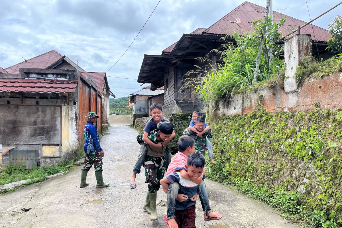 Prajurit Kodim 0304 Agam bermain bersama anak-anak selama bertugas dalam Program TNI Manunggal Membangun Desa (TMMD) ke-123. (Antara/Al Fatah)