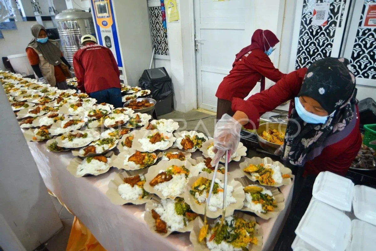Petugas masjid menyiapkan makanan untuk berbuka puasa di Masjid Al-Hakim, Padang, Sumatera Barat, Jumat (7/3/2025). Masjid Al-Hakim yang merupakan ikonik wisata halal di Padang itu menyediakan 300 porsi makanan untuk berbuka puasa secara gratis selama bulan Ramadhan. ANTARA FOTO/Iggoy el Fitra/rwa.