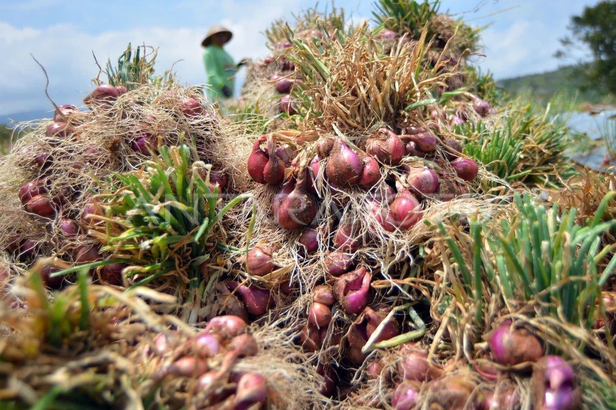 Petani memanen bawang merah di Alahan Panjang, Solok, Sumatera Barat, Minggu (20/4/2025). Kementerian Pertanian (Kementan) menyatakan bahwa pasokan bawang merah nasional siap konsumsi pada bulan April 2025 mencukupi yakni mencapai 100.000 ton.