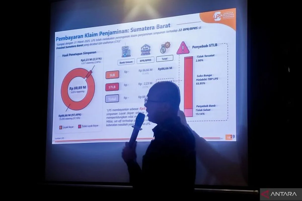 Padang (ANTARA) - Lembaga Penjamin Simpanan (LPS) telah menyelesaikan pembayaran klaim penjaminan simpanan terhadap 22 Bank Perkreditan Rakyat (BPR) dan Bank Perkreditan Rakyat Syariah (BPRS) sebesar Rp85,17 miliar hingga 31 Maret 2025.