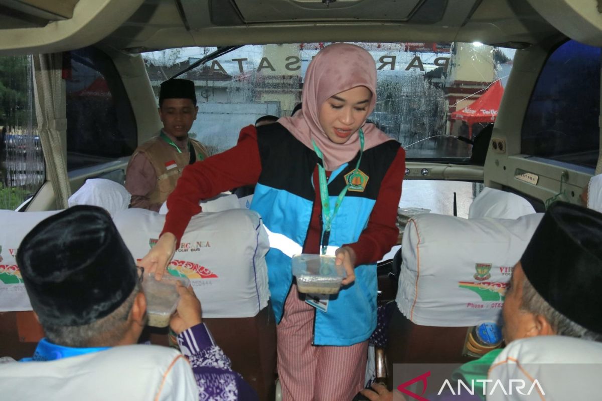 Ketua Dharma Wanita Persatuan (DWP) Kanwil Kemenag Sumbar Rosnimar selaku Koordinator Konsumsi mengatakan Embarkasi Padang menyediakan bubur kacang hijau untuk jamaah haji saat tiba di Aula Kedatangan sambil menerima informasi dari petugas.