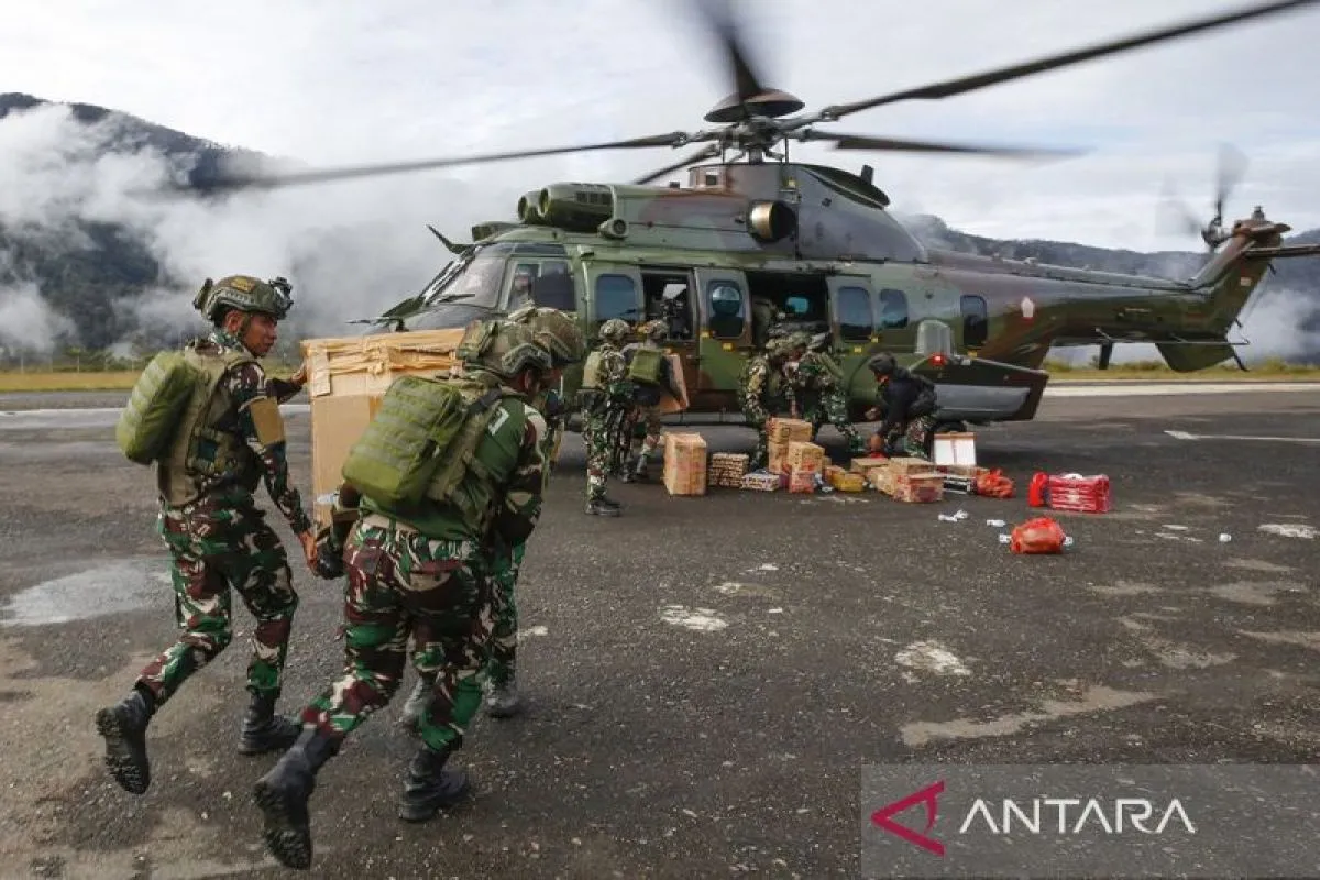 Prajurit TNI membawa logistik untuk program makan bergizi gratis perdana yang akan didistribusikan menggunakan helikopter Caracal milik TNI AU di Distrik Sugapa, Kabupaten Intan Jaya, Papua Tengah, Senin (20/1/2025). Kementerian Pertahanan melalui Komando Gabungan Wilayah Pertahanan III mendistribusikan paket makan bergizi gratis sebanyak 1.000 paket untuk para pelajar di sejumlah sekolah di daerah rawan konflik. ANTARA FOTO/Martinus Eguay/Spt.