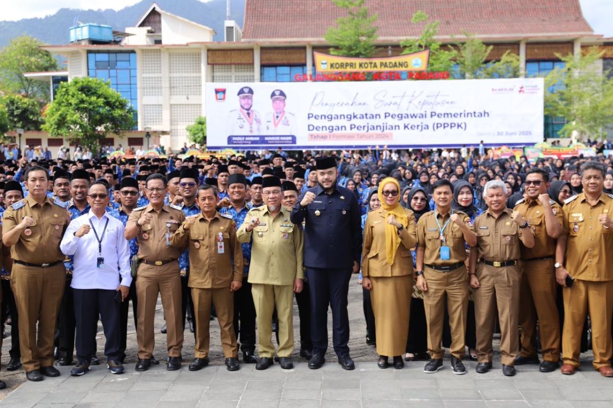 Padang (ANTARA) - Wali Kota Padang Fadly Amran secara resmi menyerahkan Surat Keputusan (SK) Pengangkatan Pegawai Pemerintah dengan Perjanjian Kerja (PPPK) formasi tahun 2024 kepada sebanyak 2.844 orang, yang digelar di Lapangan APEKSI, Balai Kota Aia Pacah, Senin (30/6/2025).