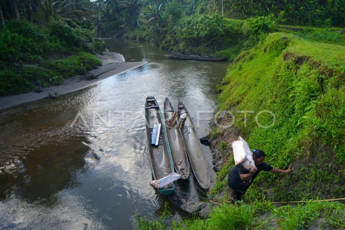 Warga memindahkan potongan batang sagu di Desa Matotonan, Siberut Selatan, Kepulauan Mentawai, Sumatera Barat, Senin (7/7/2025). Batang pohon sagu tersebut selain diolah sebagai makanan pokok masyarakat Mentawai yang biasa dijual Rp50 ribu per 25 kilogram itu juga diolah menjadi tepung dan sisanya menjadi makanan ternak. ANTARA FOTO/Iggoy el Fitra/nym.