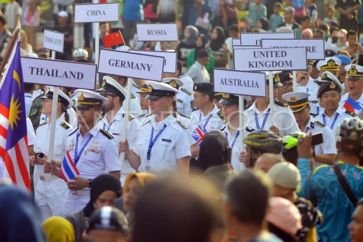 Peserta ASEAN Plus Cadet Sail (APCS) mengikuti Kirab Genderang Suling Gita Jala Taruna Akademi Angkatan Laut (AAL) di Padang, Sumatera Barat, Minggu (10/8/2025). Kirab kota tersebut dalam rangka memperkenalkan Akademi Angkatan Laut dan KRI Bima Suci kepada masyarakat yang merupakan bagian dari kegiatan praktek pelayaran Kartika Jala Krida (KJK) 2025 Angkatan ke-72 yang diikuti peserta ASEAN Plus Cadet Sail (APCS) berasal dari 21 negara.