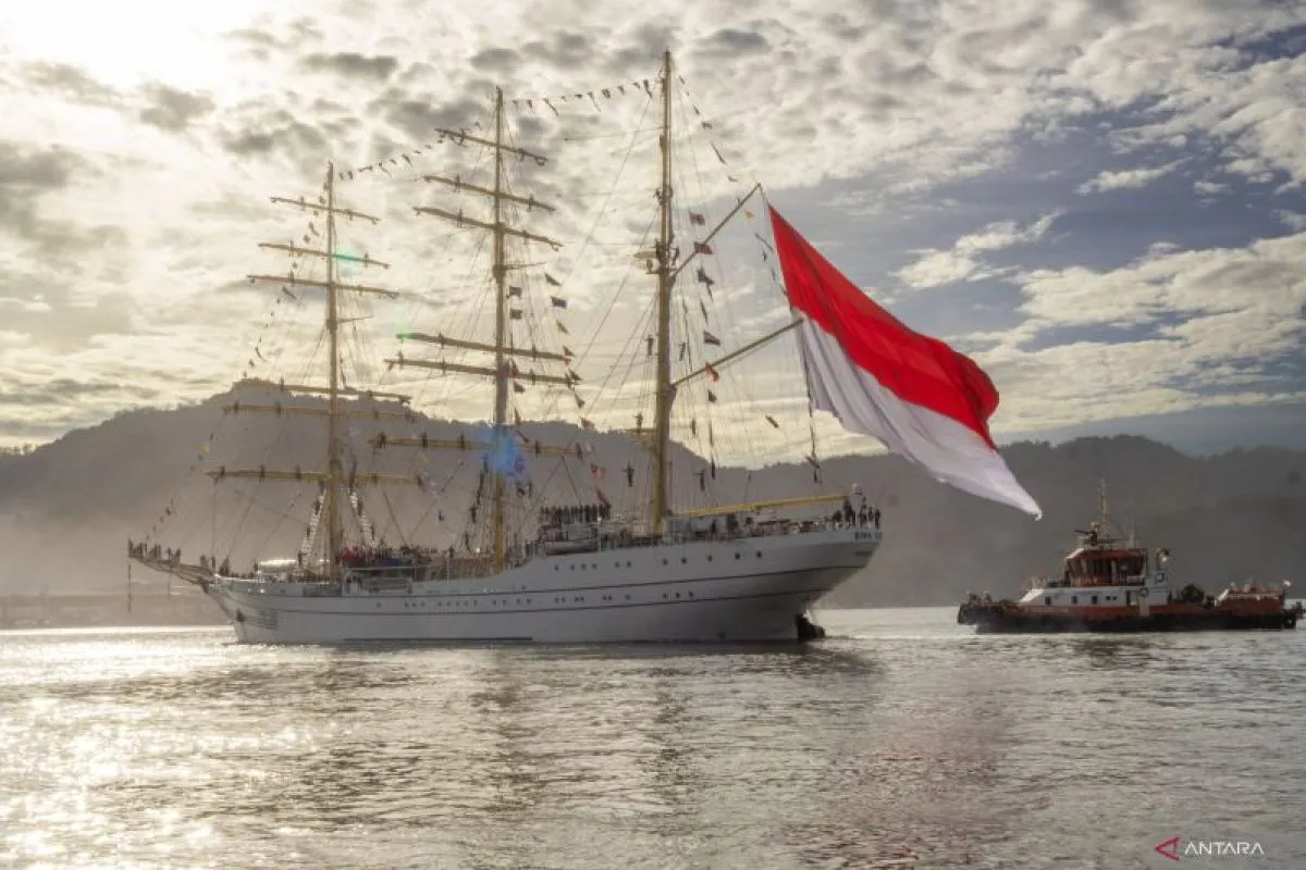 KRI Bima Suci meninggalkan Pelabuhan Teluk Bayur di Kota Padang, Sumatera Barat, Selasa (12/8/2025). Selama empat hari bersandar di pelabuhan setempat para kadet dan delegasi dari berbagai negara mengunjungi berbagai tempat wisata. ANTARA/Muhammad Zulfikar