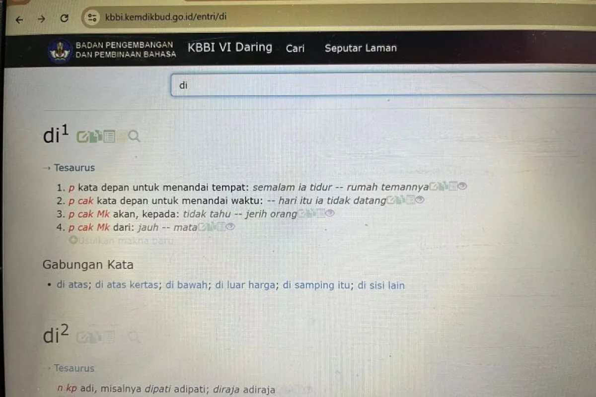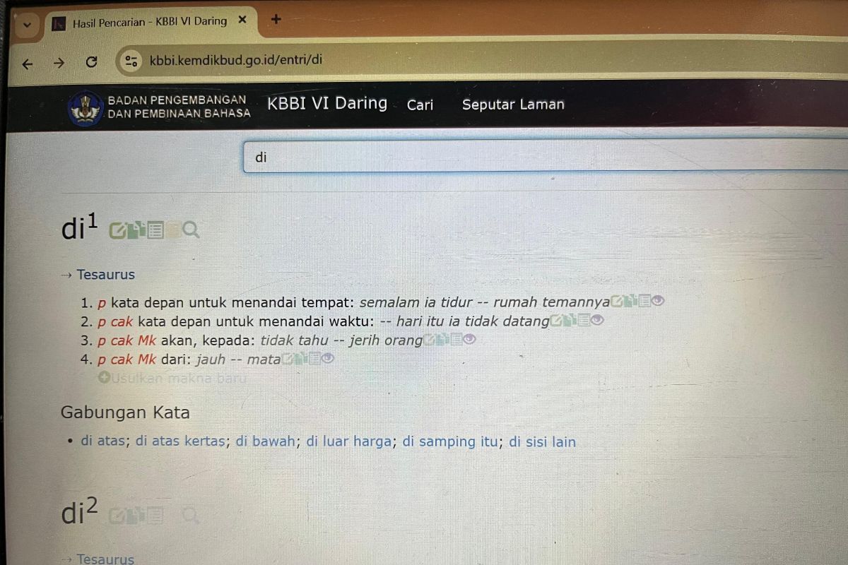 Banyak ditemukan kesalahan dalam penulisan “di” apakah harus dipisah atau digabung. Penulisan “di” yang tepat tergantung konteksnya. Jika “di” menunjukkan tempat (kata depan), maka harus dipisah, misalnya di depan, di samping, di belakang, dan di sana. Sebaliknya, jika “di” merupakan awalan kata kerja (imbuhan), maka harus digabung, seperti dijual, disimpan, dibuang, dan dimakan.