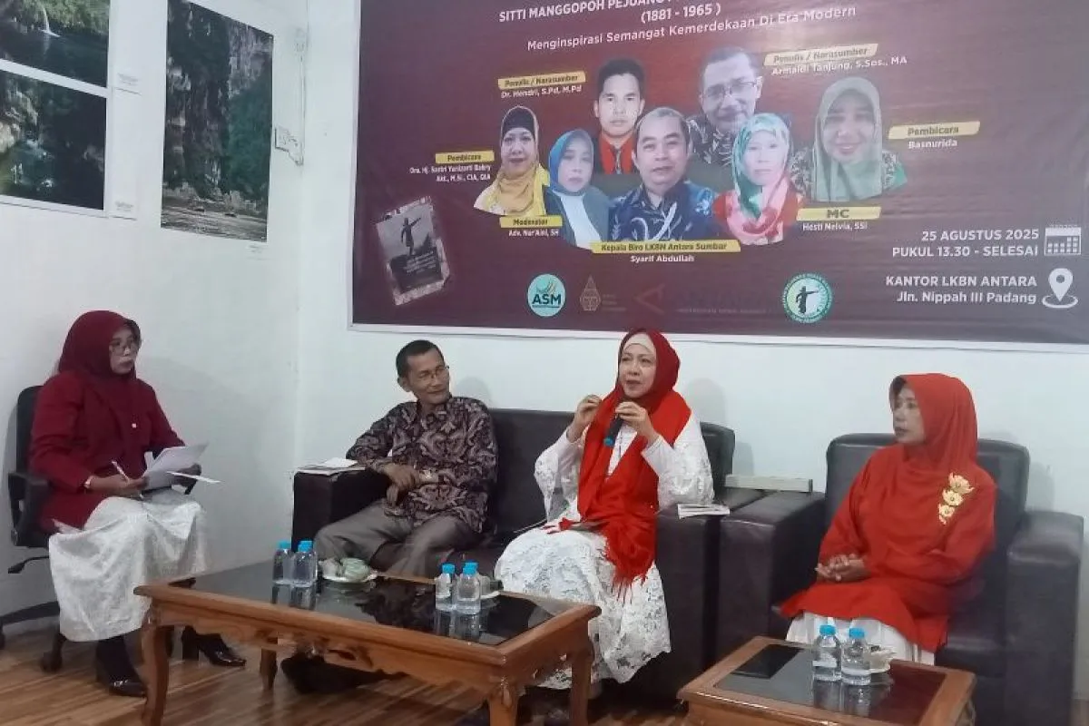 Pasang (ANTARA) - Diskusi buku Sitti Manggopoh Pejuang Perempuan dari Minangkabau karya Dr Hendri dan Armaidi Tanjung digelar di Galeri Foto Perum LKBN ANTARA Biro Sumatera Barat di Jalan Kampung Nias Kota Padang, Senin (25/8/2025). Diskusi buku kolaborasi Asosiasi Sitti Manggopoh, Ikatan Keluarga Besar Manggopoh, Yayasan Satu Pena dan Perum LKBN ANTARA Biro Sumbar itu mendorong penguatan literasi tentang kiprah perempuan pejuang asal Manggopoh Kabupaten Agam tersebut sekaligus melengkapi dan memperkuat data untuk pengajuan gelar Pahlawan Nasional. (ANTARA/Nurul Nisah Priscilla)