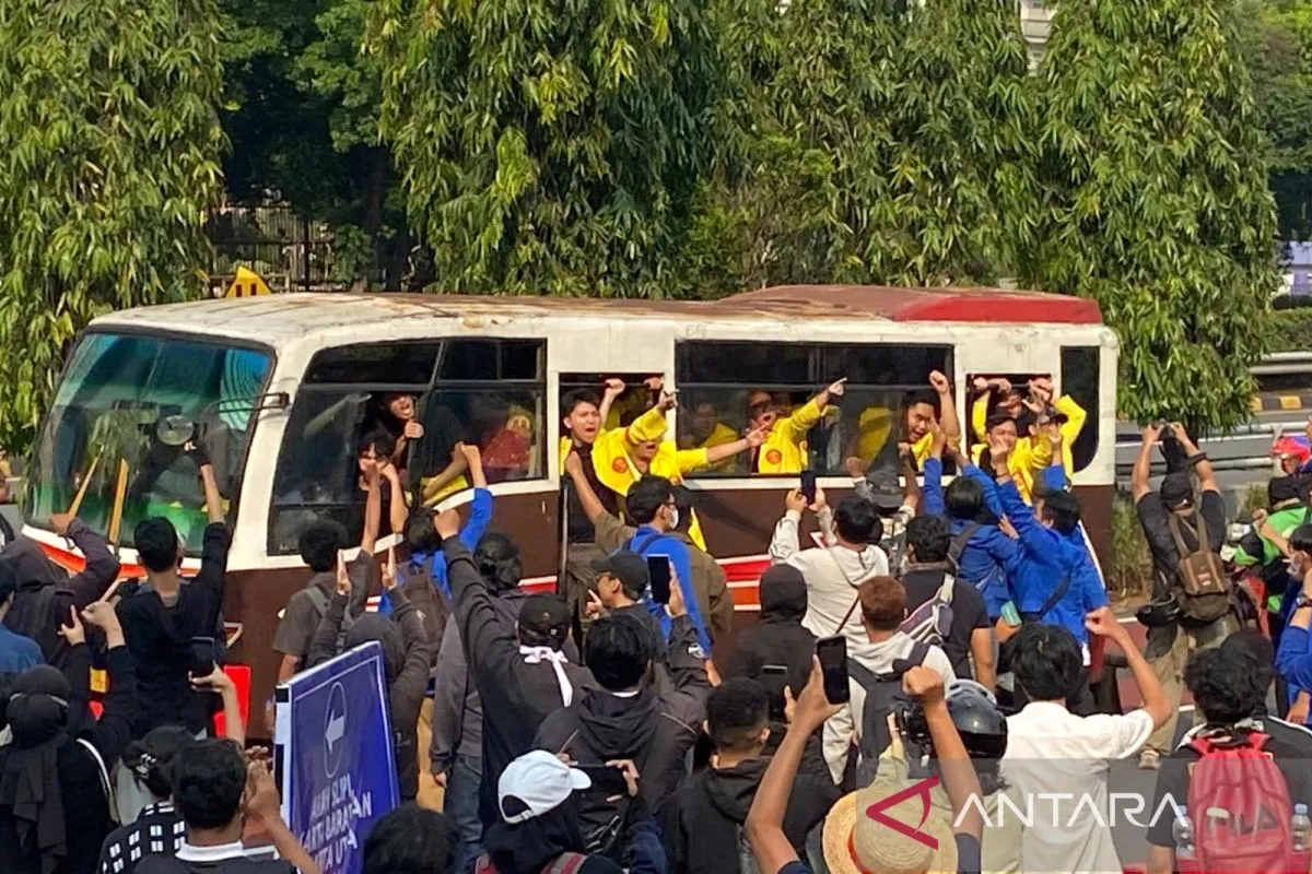 Kemudian pada pukul 15.25 WIB, terlihat sejumlah bus berisi mahasiswa UI melewati gerbang Polda Metro Jaya, tepatnya di dekat Halte Transjakarta kawasan Semanggi.