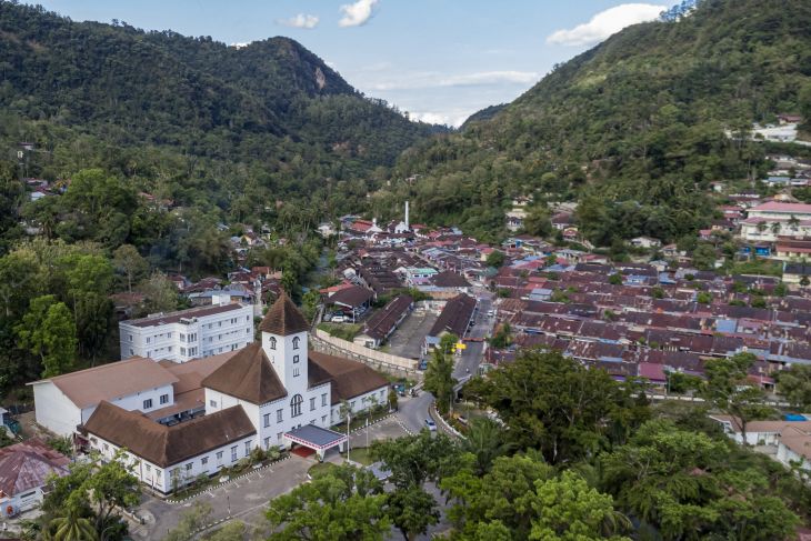 Foto udara pemandangan pusat Kota Sawahlunto, Sumatera Barat, Jumat (29/08/2025). Kota Sawahlunto dengan luas 273,45 km persegi yang berdiri pada 1888 itu terkenal sebagai kota tambang batu bara yang memiliki daya tarik sebagai kawasan wisata. (ANTARA/Fandi Yogari) (ANTARA/Fandi Yogari/Fandi Yogari Saputra)