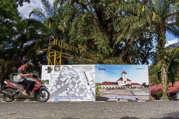 Pengendara melintas di depan Rencana Taman Lapangan Segitiga Hotel Saka Heritage Ombilin, Kota Sawahlunto, Sumatera Barat, Jumat (29/08/2025). Selain melakukan revitalisasi pada bangunan cagar budaya yang berdiri tahun 1916, PT. Bukit Asam juga berencana menata kawasan taman lapangan segitiga yang berada di depan Hotel Saka Heritage Ombilin. (ANTARA/Fandi Yogari/Fandi Yogari Saputra)