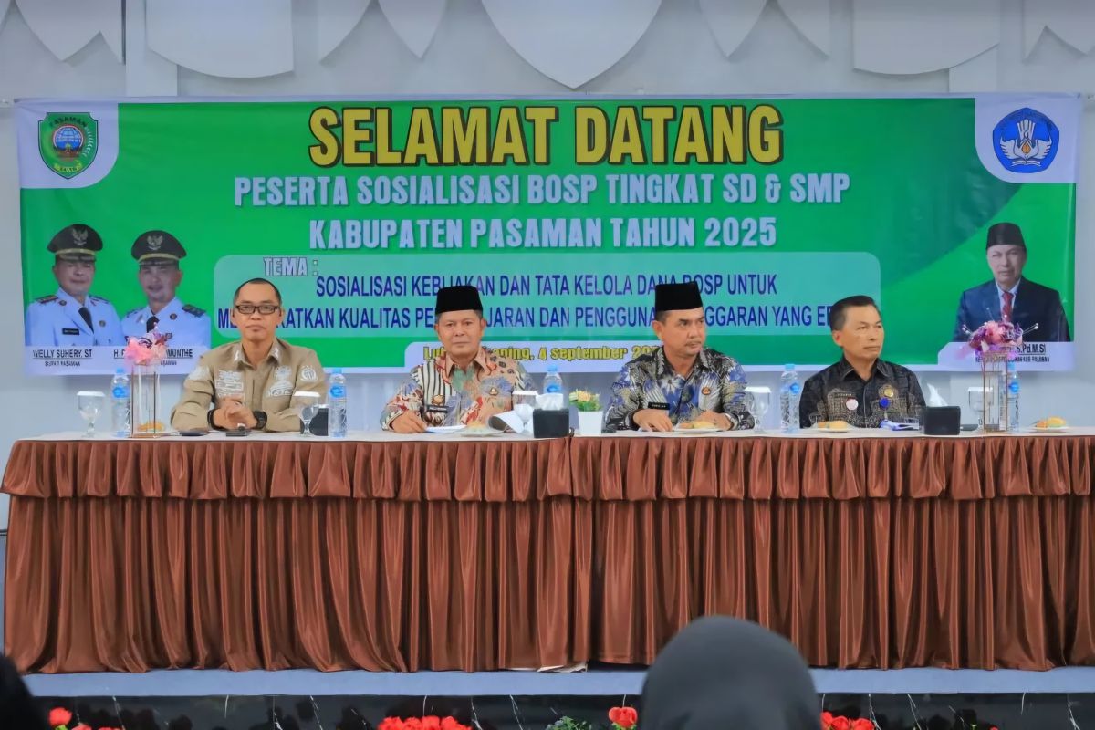 Bupati Pasaman Welly Suhery didampingi Wakil Bupati Parulian Dalimunte serta Kajari Pasaman Sobeng Suradal dalam acara sosialisasi penggunaan anggaran BOSP SD-SMP di Lubuk Sikaping, Kamis (4/9/2025).ANTARA/Heri Sumarno