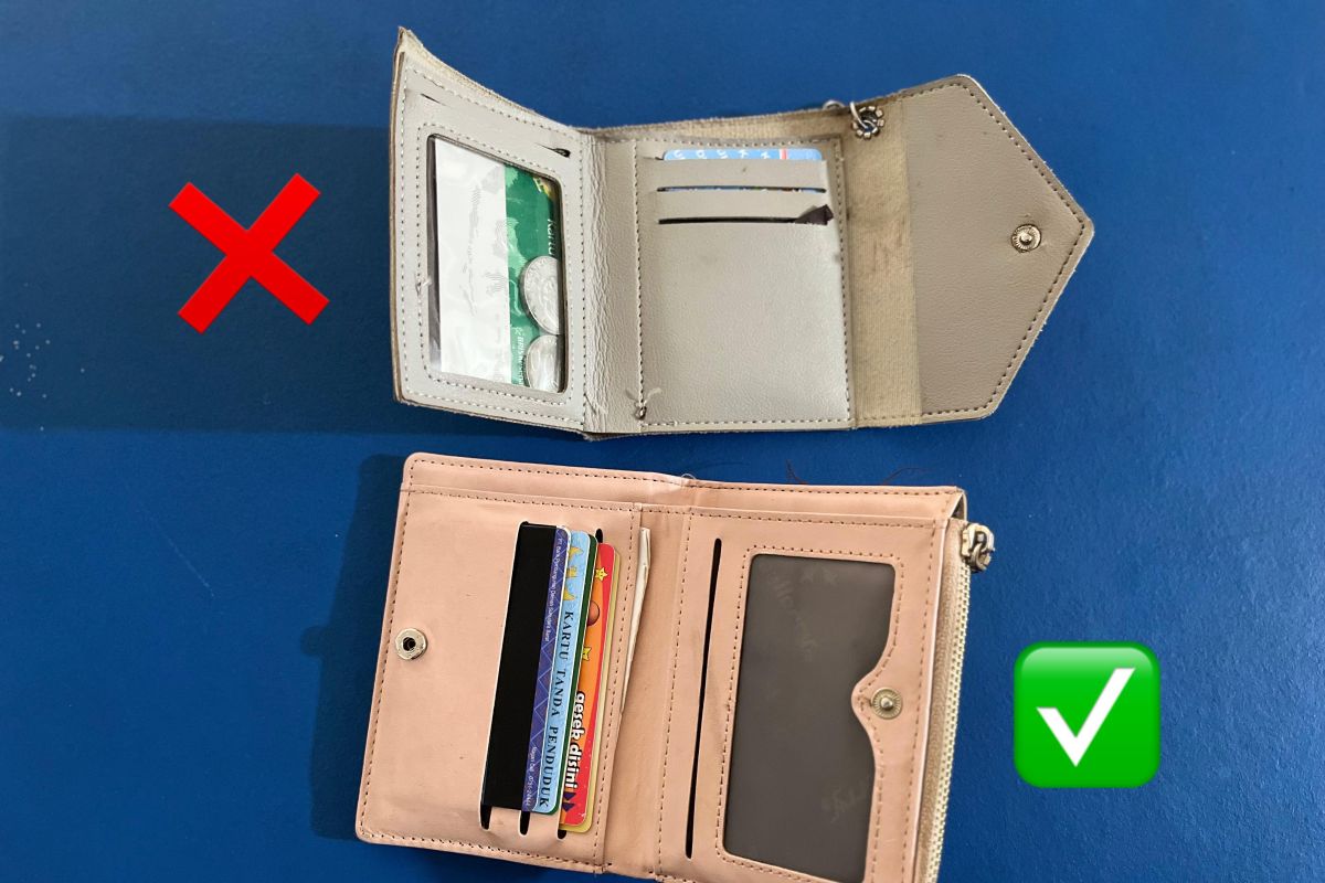 1. Perhatikan bahan dan desain. Dompet yang aman tidak harus terbuat dari bahan yang kuat, melainkan desain dompet perlu diperhatikan. Pilih dompet yang menggunakan bahan kuat seperti, kulit atau kanvas. Dua opsi ini dapat menjadi pilihan kalian dalam memilih. Namun perhatikan juga desain dompetnya, pilihlah dompet dengan resleting atau desain slot kartu mengarah ke dalam, hindari tidak keluar yang mengarah ke sela-sela dompet, hal tersebut membuat rentan kehilangan aset berharga kalian.