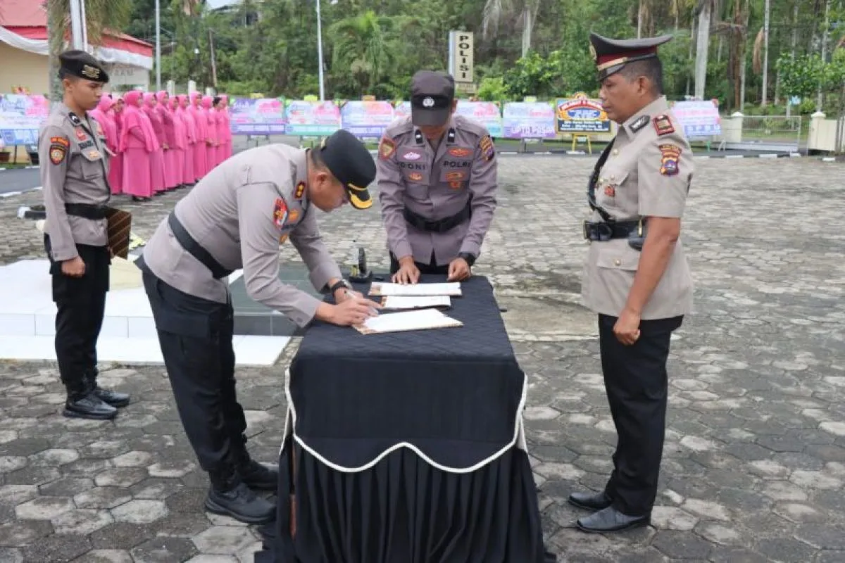 Upacara serah terima jabatan (Sertijab) dipimpin Kapolres Sawahlunto AKBP Simon Yana Putra di Mapolres Sawahlunto, Kamis (11/9). Acara berlangsung khidmat dengan pengambilan sumpah jabatan, penandatanganan berita acara, dan pakta integritas.