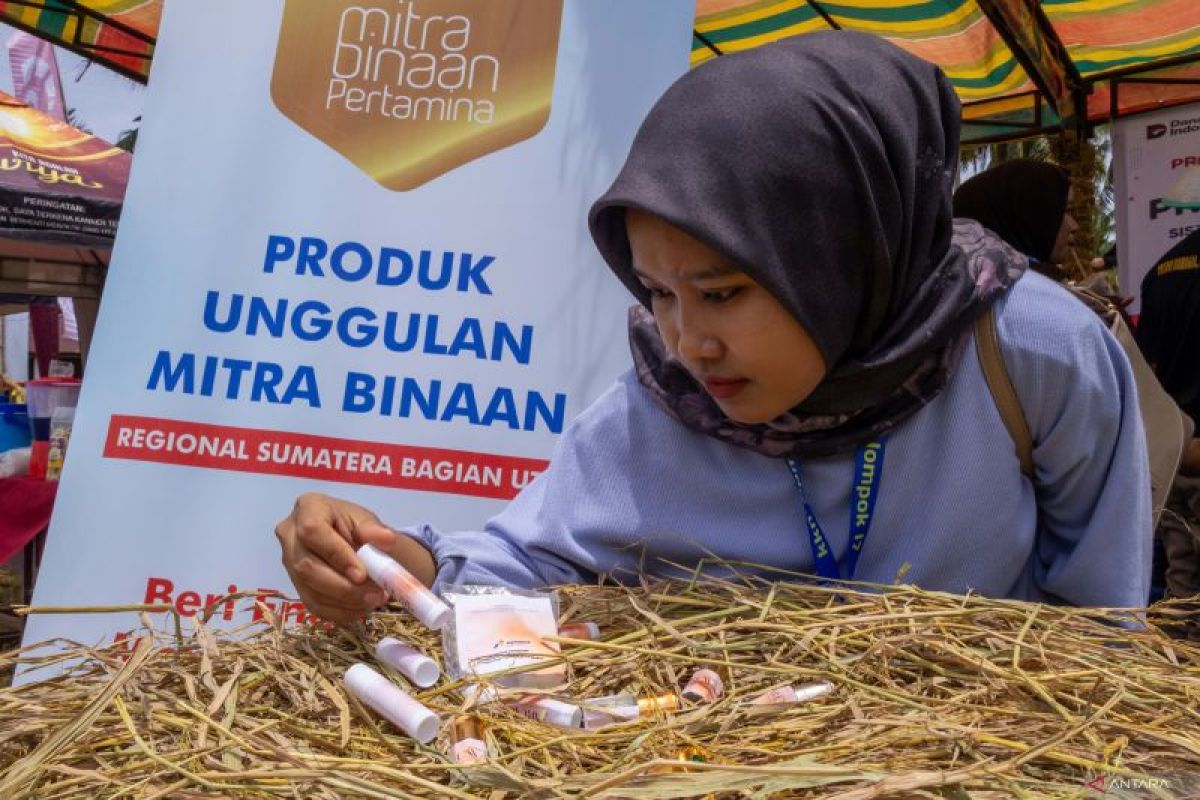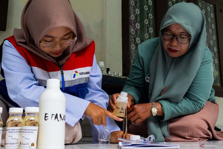 Pengunjung memperhatikan parfum jerami hasil inovasi Kelompok Usaha Kompos Sejahtera Bersama (Ukasema) binaan Pertamina Patra Niaga di Nagari Padang Toboh Ulakan, Kabupaten Padang Pariaman, Sumatera Barat, Sabtu (16/8/2025). Parfum dengan campuran bioetanol jerami ini merupakan hasil kolaborasi Pertamina dengan Universitas Andalas. ANTARA/Muhammad Zulfikar