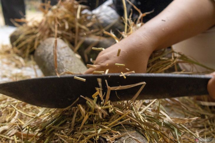 Tumpukan jerami kering dibagi merata sebelum dicincang. Ialah dua perempuan yang telah siap dengan lading di genggamannya. Dengan cekatan, mereka mulai mencincang batang padi yang sudah kering itu menjadi potongan-potongan kecil.