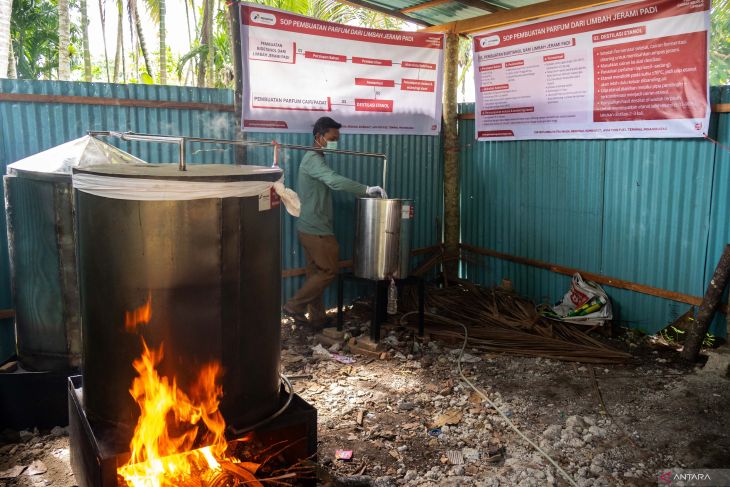Anggota Kelompok Usaha Kompos Sejahtera Bersama (Ukasema) mencacah jerami kering menjadi potongan kecil untuk selanjutnya diolah menjadi bioetanol di Nagari Padang Toboh Ulakan, Kabupaten Padang Pariaman, Sumatera Barat, Sabtu (23/8/2025). Parfum dengan campuran bioetanol jerami ini merupakan hasil kolaborasi Pertamina dengan Universitas Andalas. (ANTARA/Muhammad Zulfikar)Anggota Kelompok Usaha Kompos Sejahtera Bersama (Ukasema) mencacah jerami kering menjadi potongan kecil untuk selanjutnya diolah menjadi bioetanol di Nagari Padang Toboh Ulakan, Kabupaten Padang Pariaman, Sumatera Barat, Sabtu (23/8/2025). Parfum dengan campuran bioetanol jerami ini merupakan hasil kolaborasi Pertamina dengan Universitas Andalas. (ANTARA/Muhammad Zulfikar)Anggota Kelompok Usaha Kompos Sejahtera Bersama (Ukasema) mencampurkan molase ke dalam tumpukan jerami sebelum direbus untuk diolah menjadi bioetanol di Nagari Padang Toboh Ulakan, Kabupaten Padang Pariaman, Sumatera Barat, Sabtu (23/8/2025). Parfum dengan campuran bioetanol jerami ini merupakan hasil kolaborasi Pertamina dengan Universitas Andalas. (ANTARA/Muhammad Zulfikar)Anggota Kelompok Usaha Kompos Sejahtera Bersama (Ukasema) mengawasi proses perebusan jerami padi untuk mendapatkan bioetanol yang digunakan sebagai senyawa utama campuran pembuatan parfum di Nagari Padang Toboh Ulakan, Kabupaten Padang Pariaman, Sumatera Barat, Selasa (16/9/2025). Parfum dengan campuran bioetanol jerami ini merupakan hasil kolaborasi Pertamina dengan Universitas Andalas. (ANTARA/Muhammad Zulfikar)